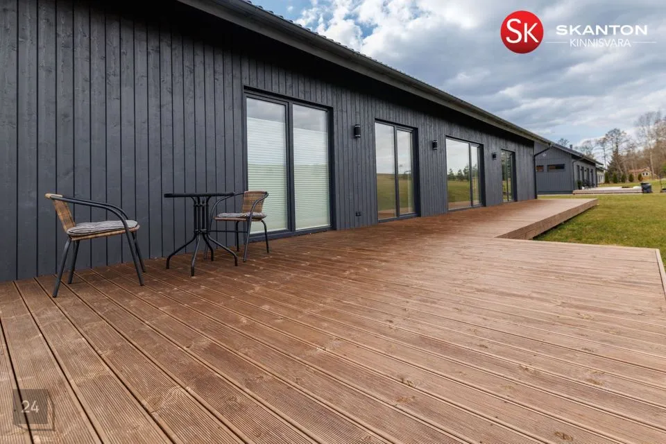 Elamu tagumisel küljel asub 53,1 m² suurune terrass. Sinna pääseb avatud planeeringuga köök-elutoast, sauna eesruumist ka kahest magamistoast.