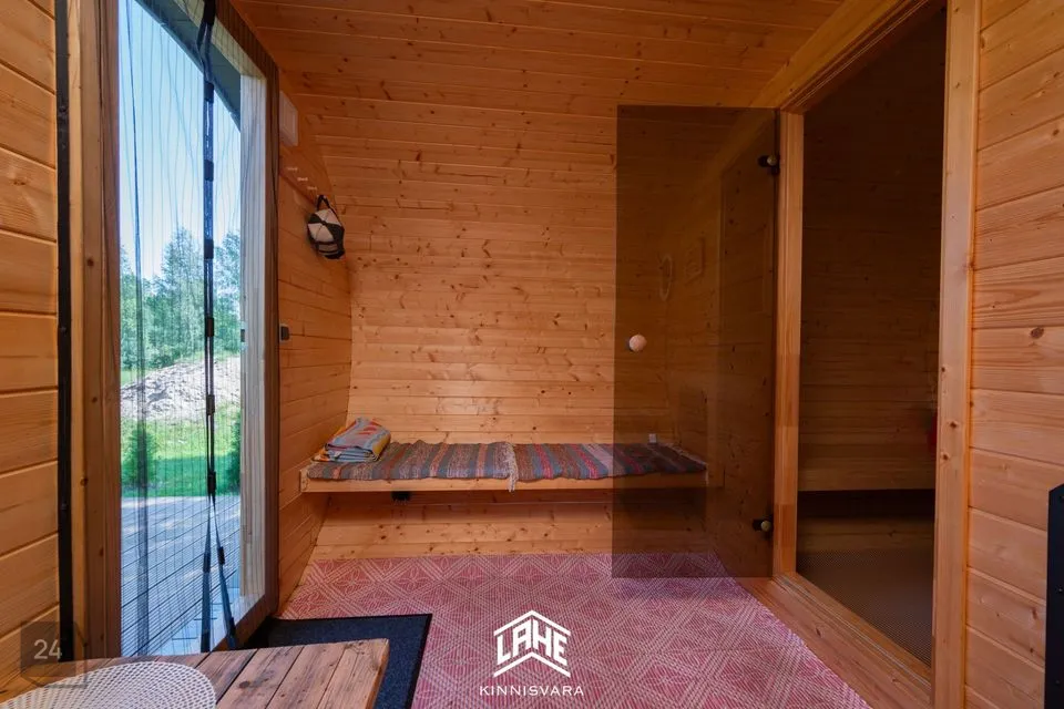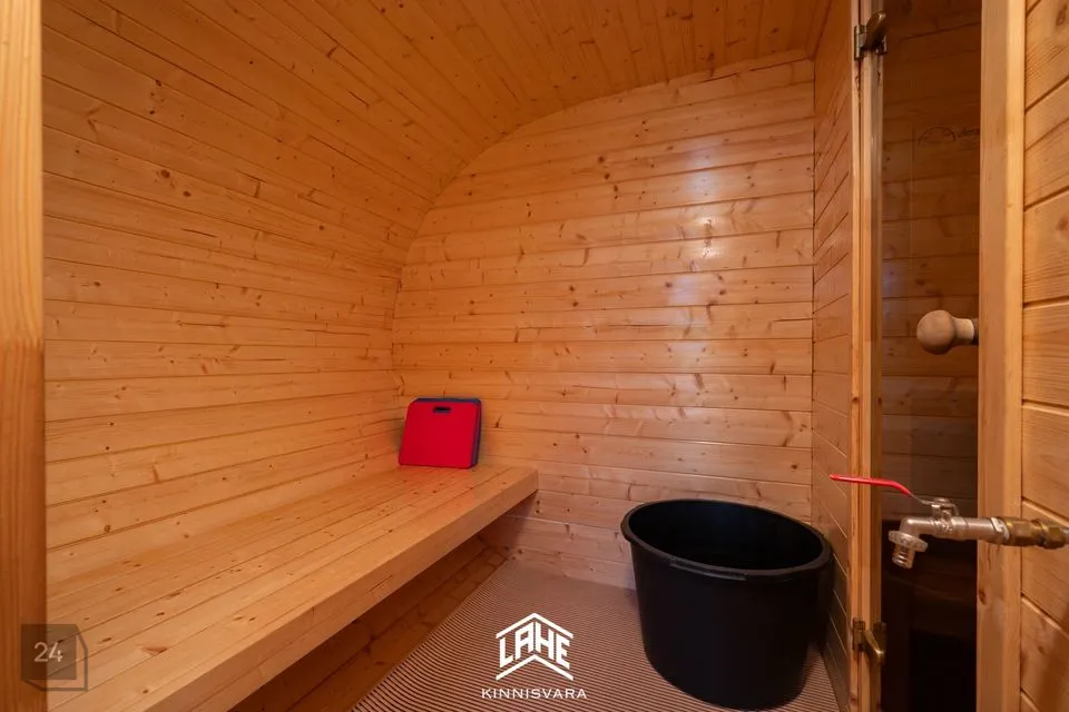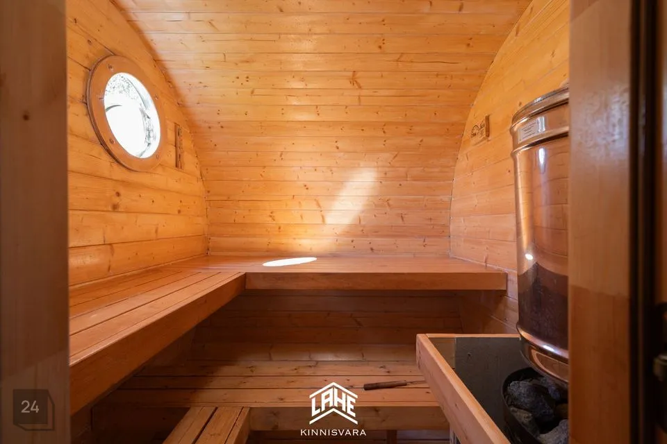 Terrassiga iglusaun on paigutatud privaatse liivarannaga tiigi kaldale.