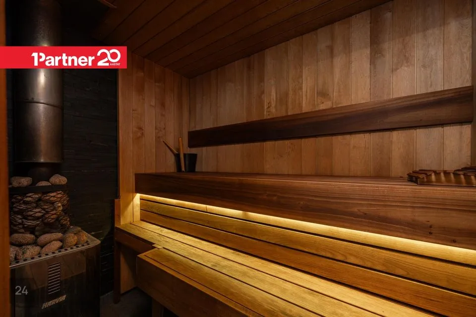 sauna eesruum, duširuum ja puuküttega leilisaun