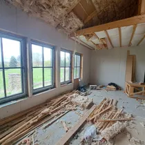 Majakarp on valmis ja katuse all, siseviimistlus puudub.Osaliselt on soojustus alla kukkunud ja vajab sättimist.