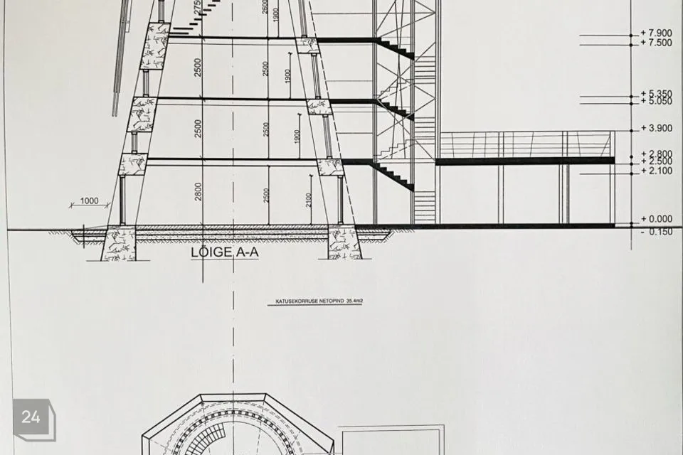 Veski ehitusalune pind 75 m2, suletud netopind 109,7 m2, 4 korrust pluss katusealune.