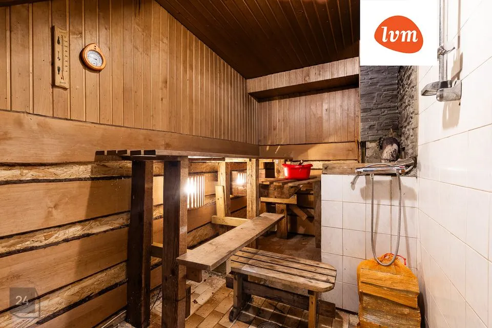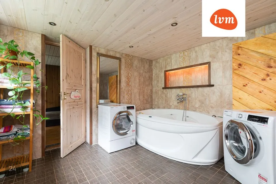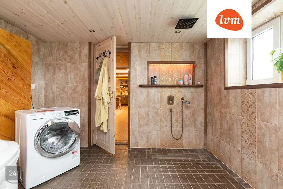 Esimesel korrusel esik, mahuka garderoobkapiga. Kaks tualetti , suur mullivanniga vannituba. Saun, kaminaga sauna eesruum. Lisaks vana vannituba, mis hetkel renoveerimata, kuid on plaanitud teha pesuruumiks.