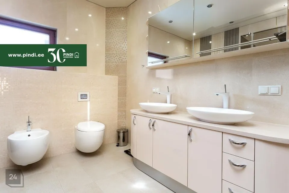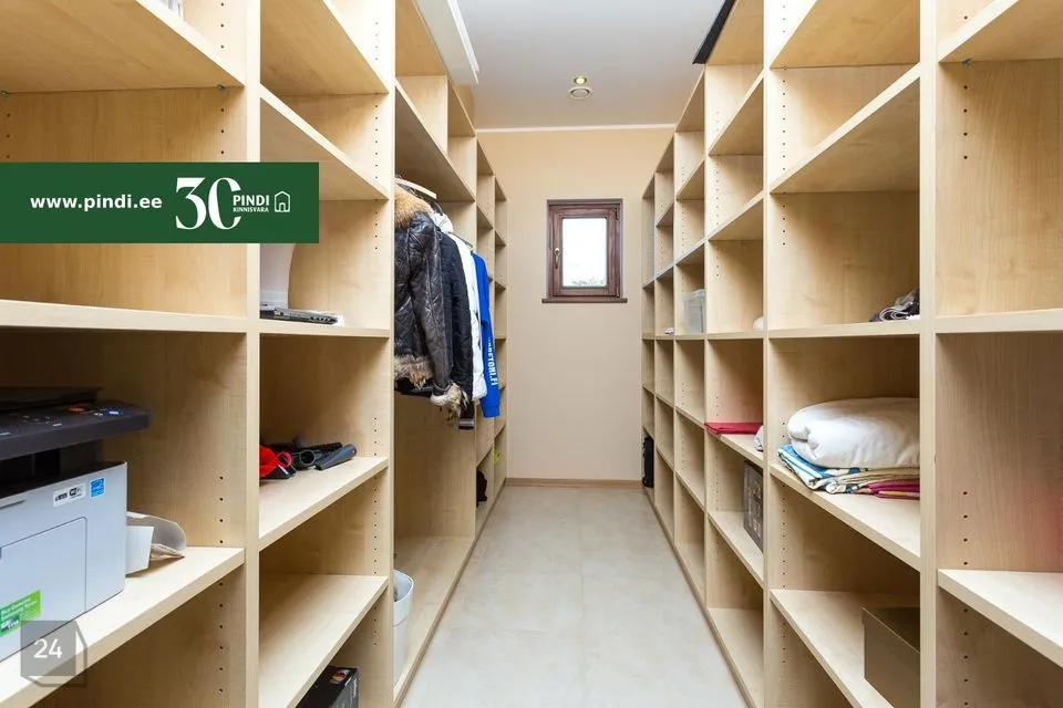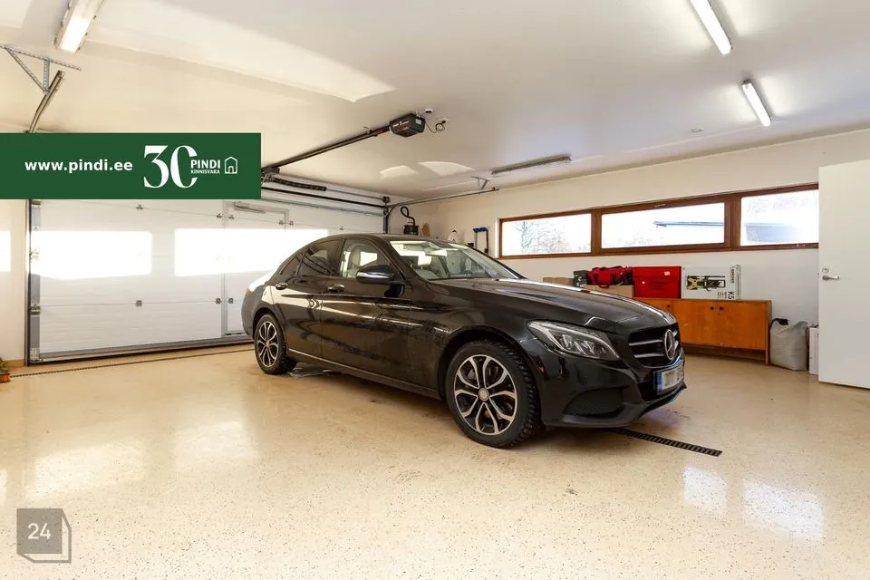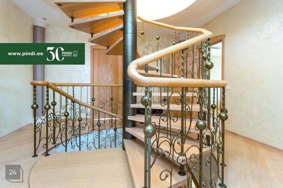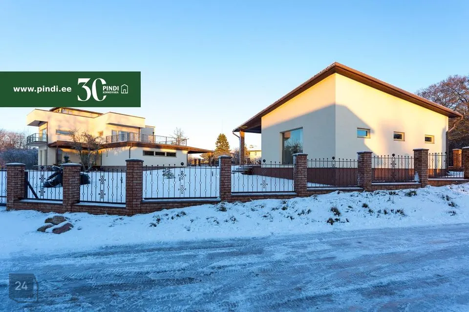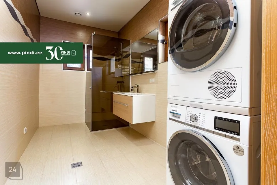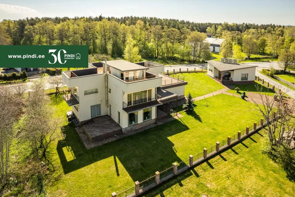 Esimesel korrusel asuvad: avar ning valgusküllane elutuba kaminaga 37m2, köök disainmööbliga 25m2, terrass vaatega aeda 21m2. Avar trepihall 30m2, esik 18m2, mahukas garderoob 7m2, katlaruum 8m2. Esikust pääseb kahe autokohaga garaaži 54,5m2, mahub ka maastur. Lisaks abiruumidest olemas: sahver, panipaik 8m2 ja duššiga majapidamisruum 7,8m2. Komandal korrusel 72m2 terrass.