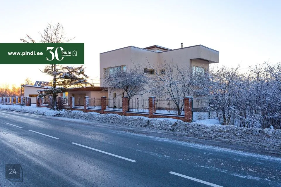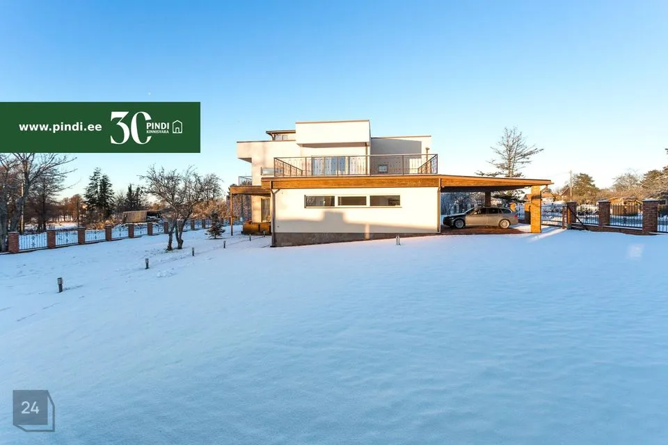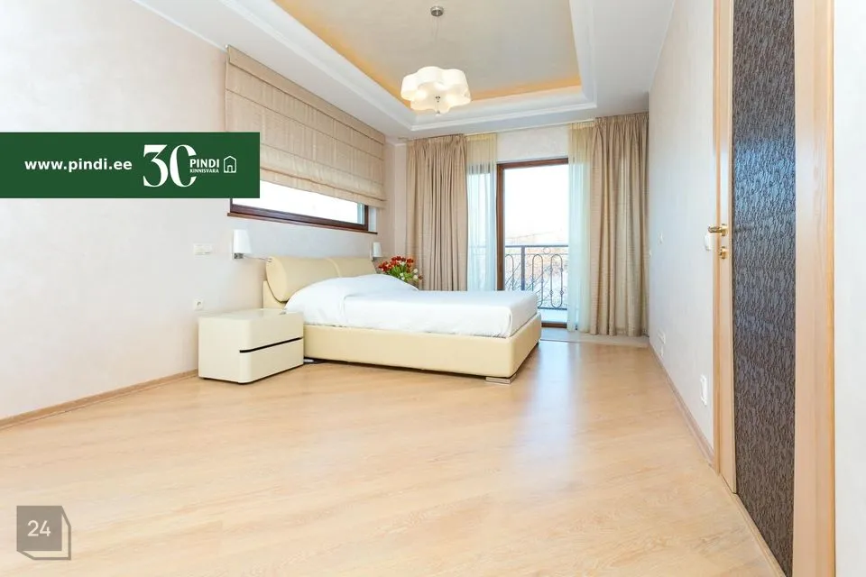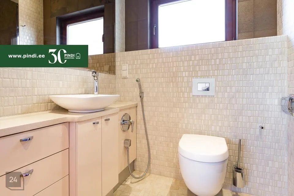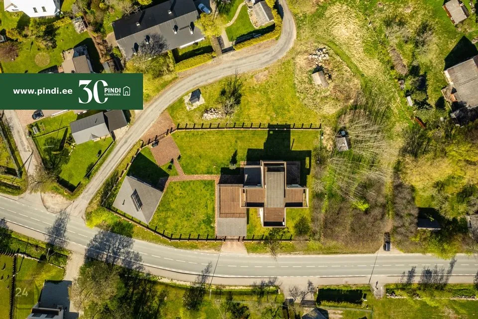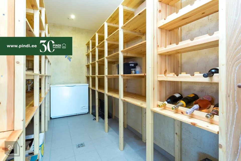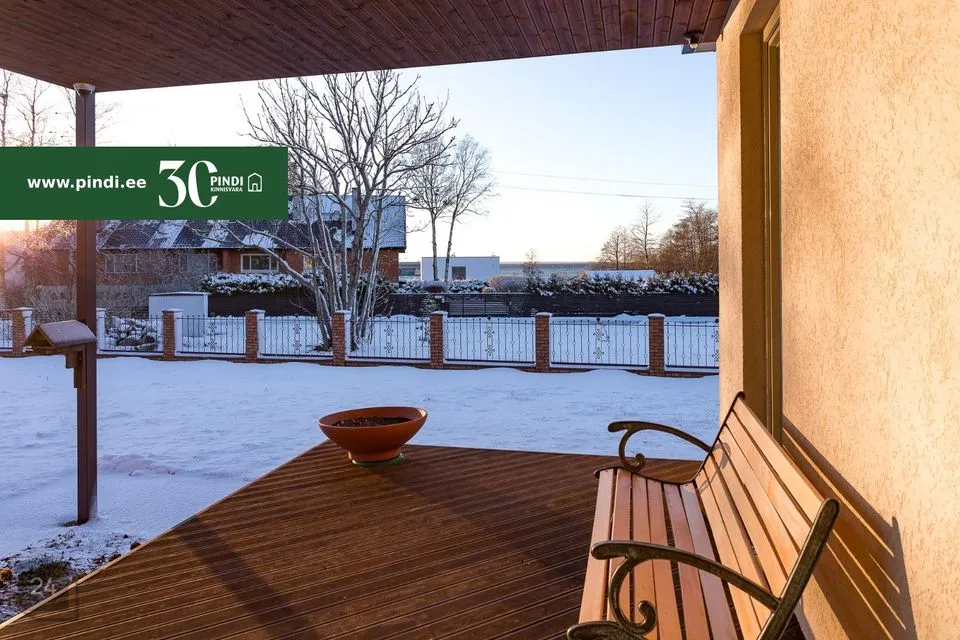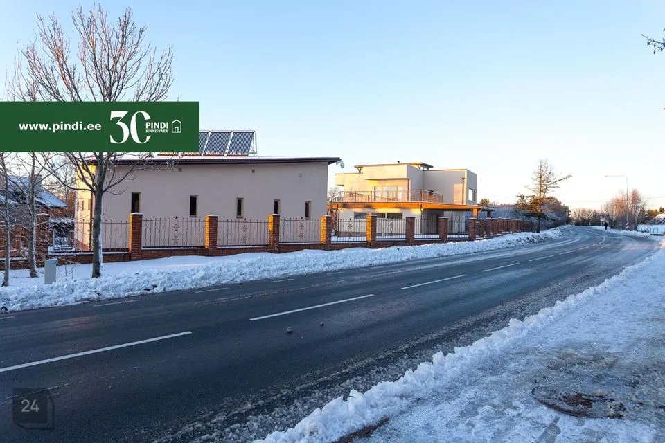 Esimesel korrusel asuvad: avar ning valgusküllane elutuba kaminaga 37m2, köök disainmööbliga 25m2, terrass vaatega aeda 21m2. Avar trepihall 30m2, esik 18m2, mahukas garderoob 7m2, katlaruum 8m2. Esikust pääseb kahe autokohaga garaaži 54,5m2, mahub ka maastur. Lisaks abiruumidest olemas: sahver, panipaik 8m2 ja duššiga majapidamisruum 7,8m2. Komandal korrusel 72m2 terrass.