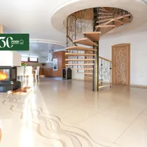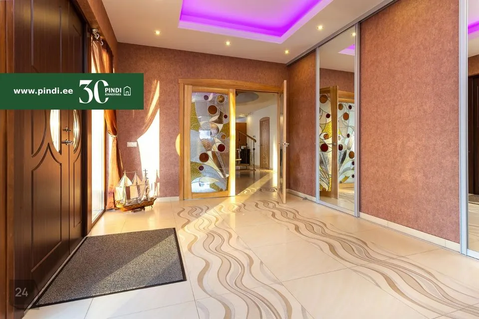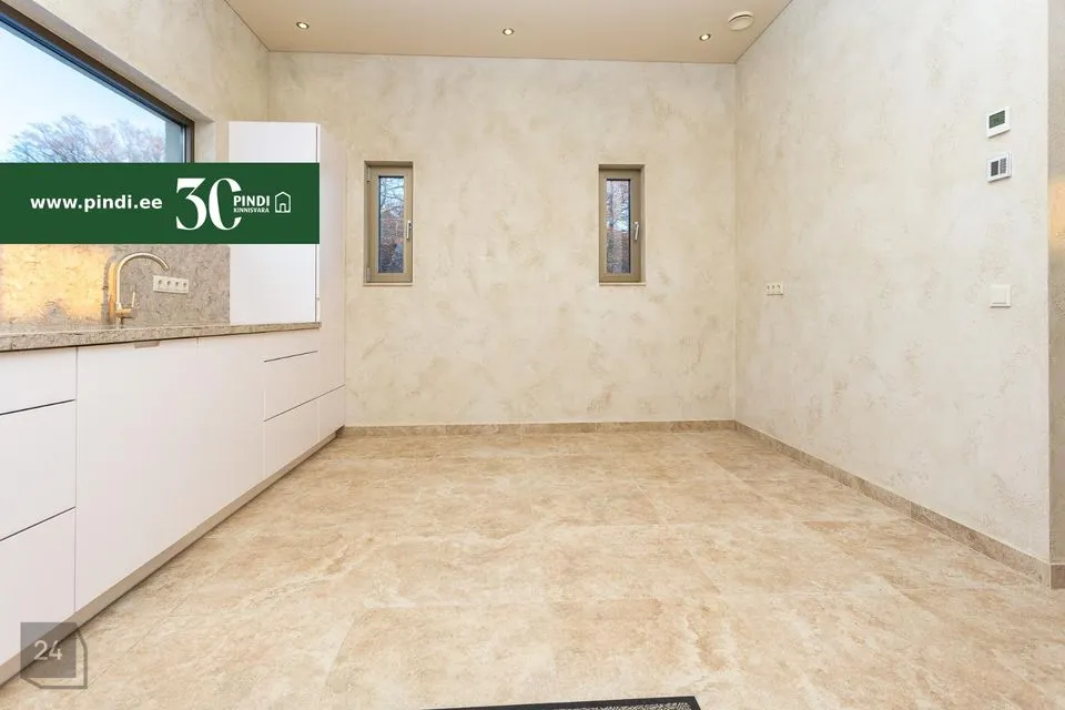 Naturaalparkett, LED-valgustusega sisetrepid, täispuidust uksed, puit-alumiinium aknad, dimmerdatavad LED-valgusallikad.