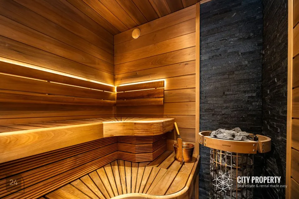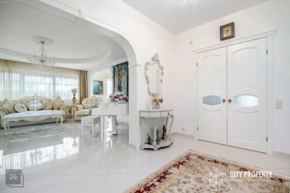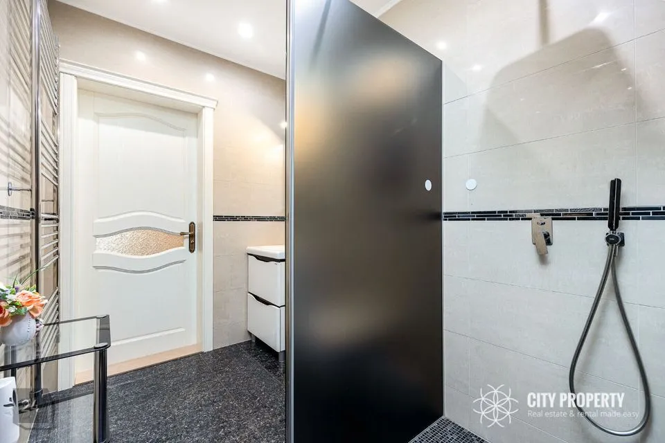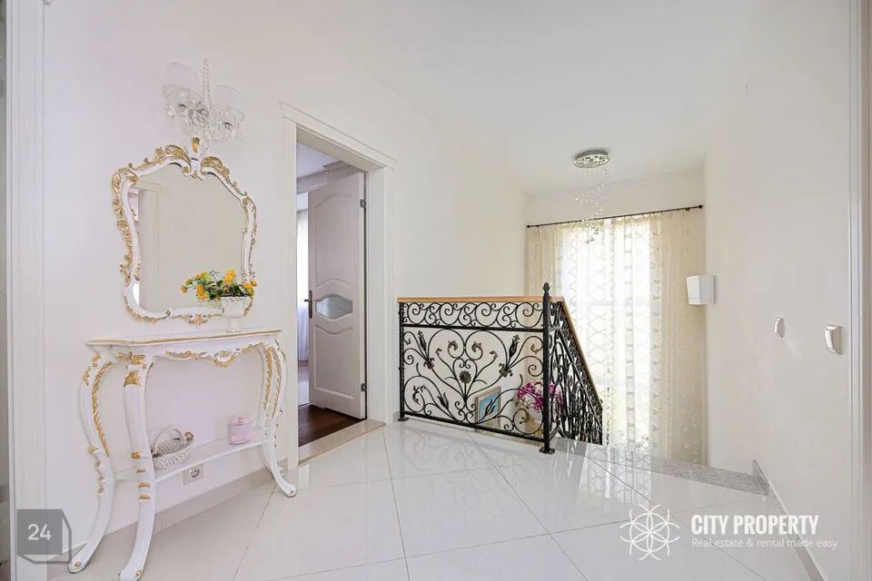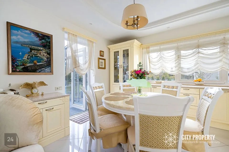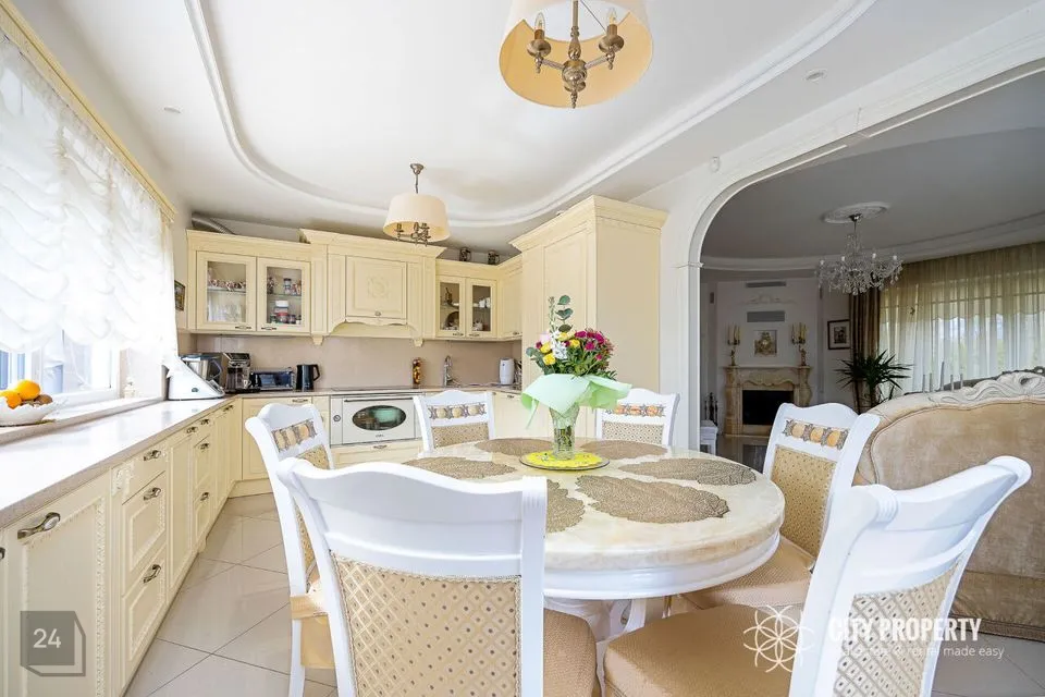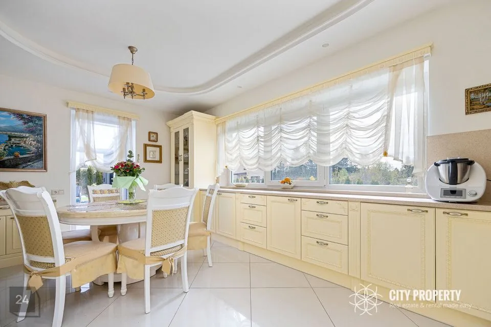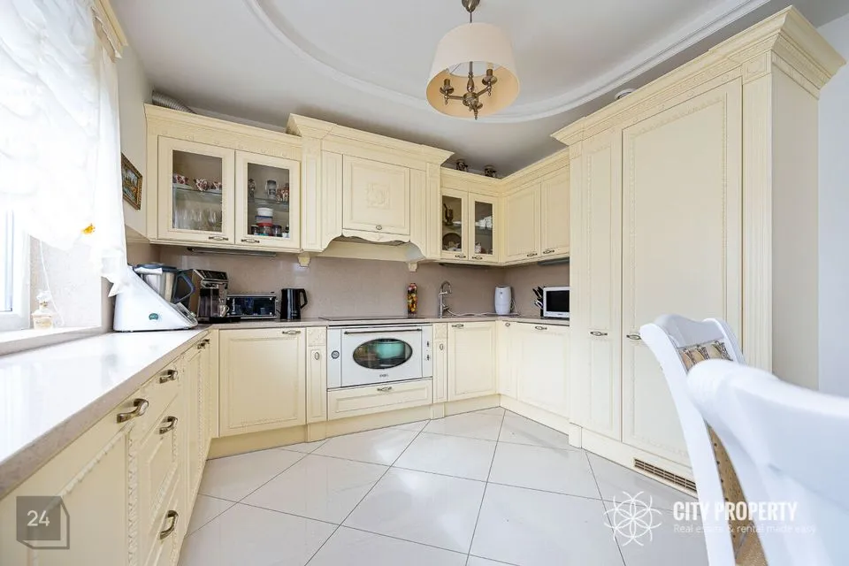 - Köök – poolavatud luksuslik köök koos kvaliteetse eritellimusel valmistatud köögimööbli ja integreeritud tehnikaga — induktsioonpliit, SMEG elektriahi, nõudepesumasin, õhupuhasti, külmkapp, mikrolaineahi. Köögitöötasapind on valmistatud kvaliteetsest kunstgraniidist. Olemas suur laud, kus võimalik nautida õhtusööki tervel perel.