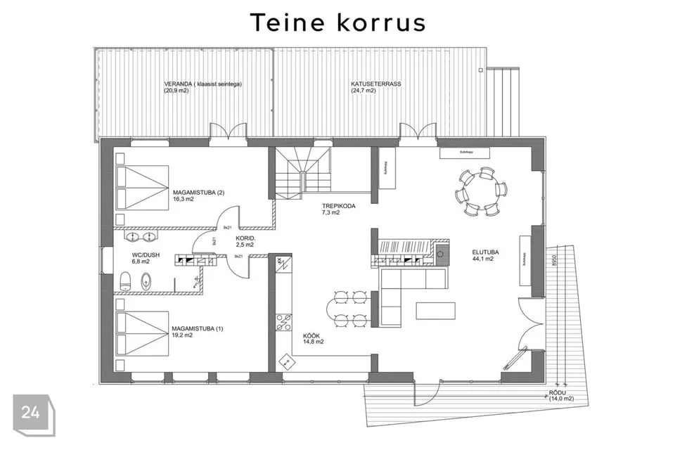 2-korruse lõunapoolses tiivas asub merevaate ning kaminaga söögisaal, rõdu, elutuba ja köök. Teises tiivas paikneb vannituba ning kaks magamistuba, millest üks on ühendatud suure rõduga.
