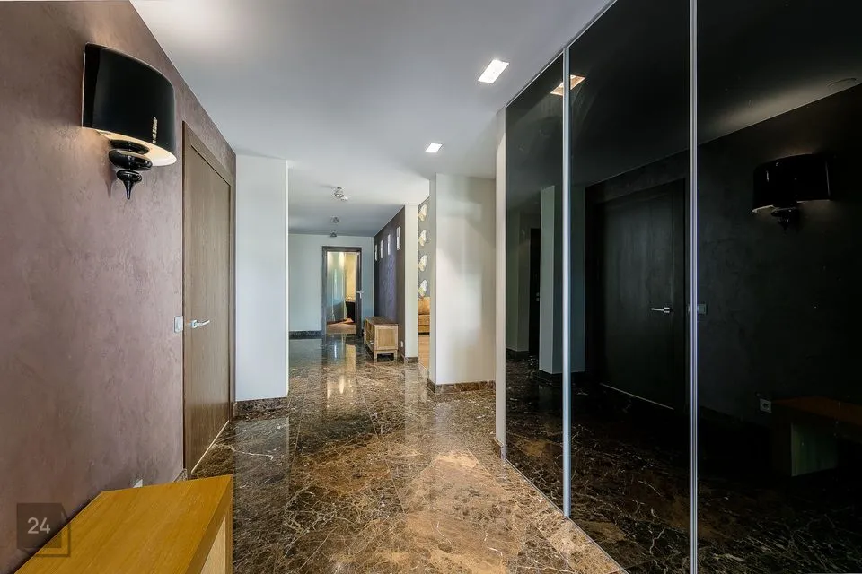 Esiku põrandat katab silmapaistev suur marmorplaat (tumepruun ebakorrapärase heleda veeniga).