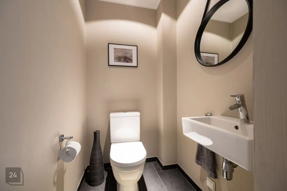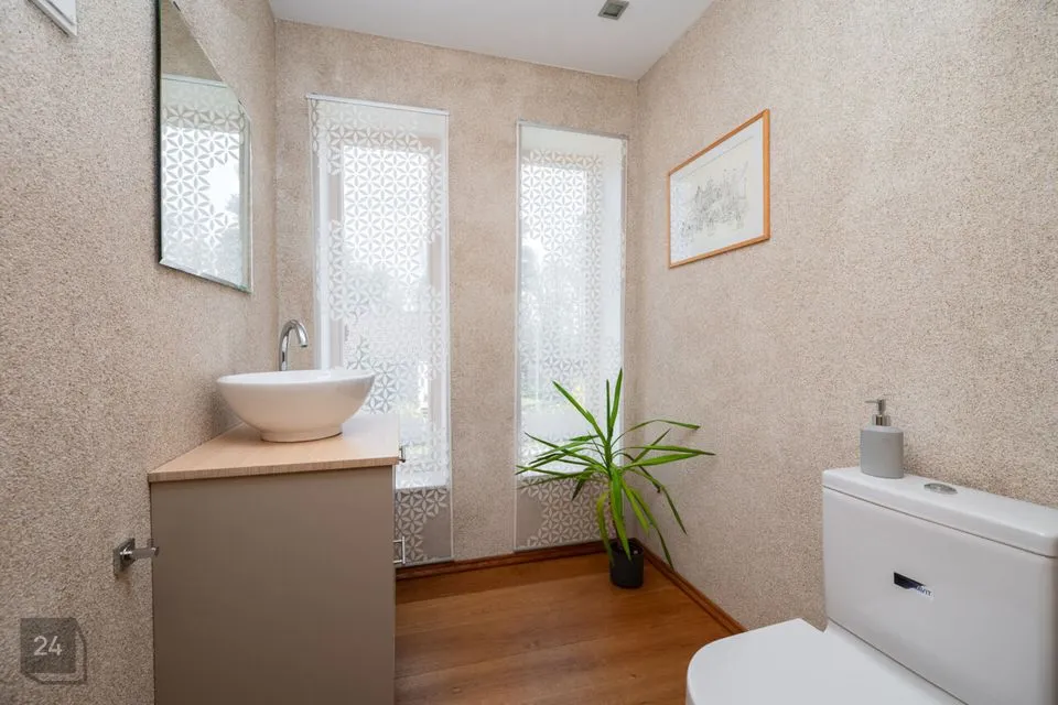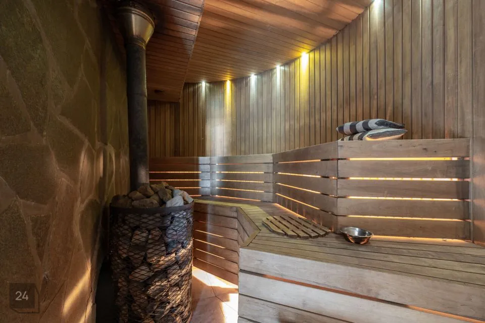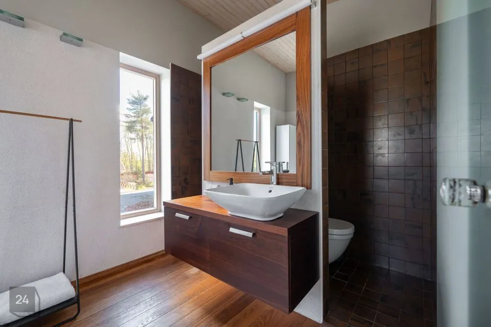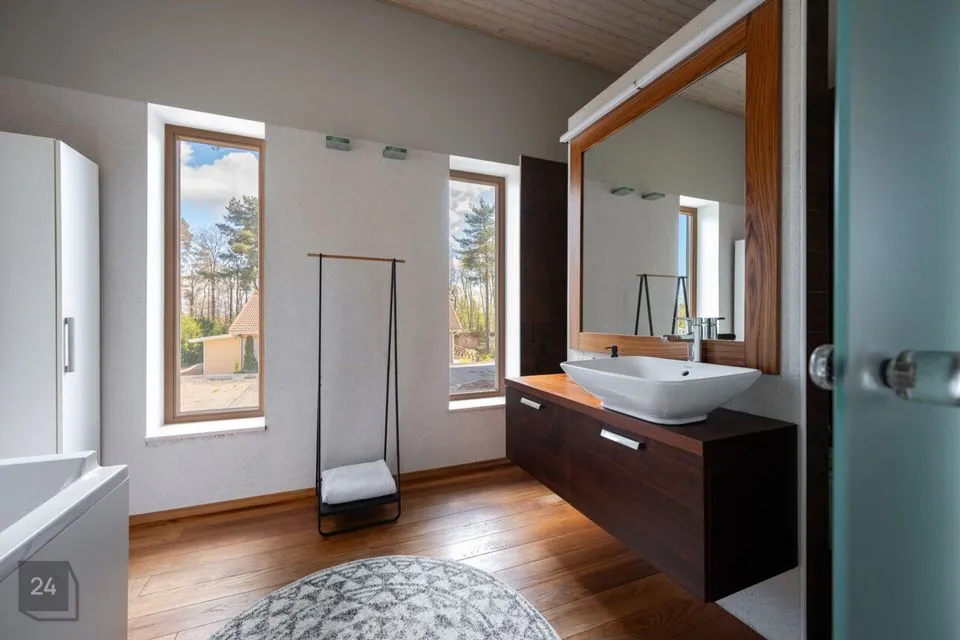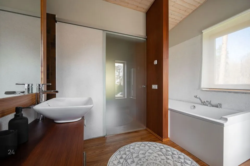 Sauna eesruum, avar pesuruum ja saun ise on kujundatud modernsete hallide keraamiliste plaatidega, mis lisavad ruumidele kaasaegset ilmet ja vastupidavust. Alumise korruse WC-s kohtuvad tumedad keraamilised plaadid ja maalähedased värvitoonid, ülemise korruse WC-s aga loob soojust puidust põrand. Master bedroomi privaatne vannituba kombineerib pruunikaid keraamilisi plaate ja naturaalset puitpõrandat, pakkudes luksuslikku, ent samas kodust tunnet. Mõnusat kodutunnet on sisse toodud ka puidutooni siseuste ja liistudega ning modernset joont aitavad hoida suured ning massiivsed klaaspinnad.