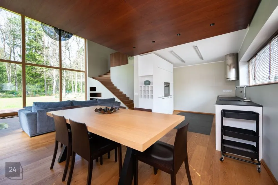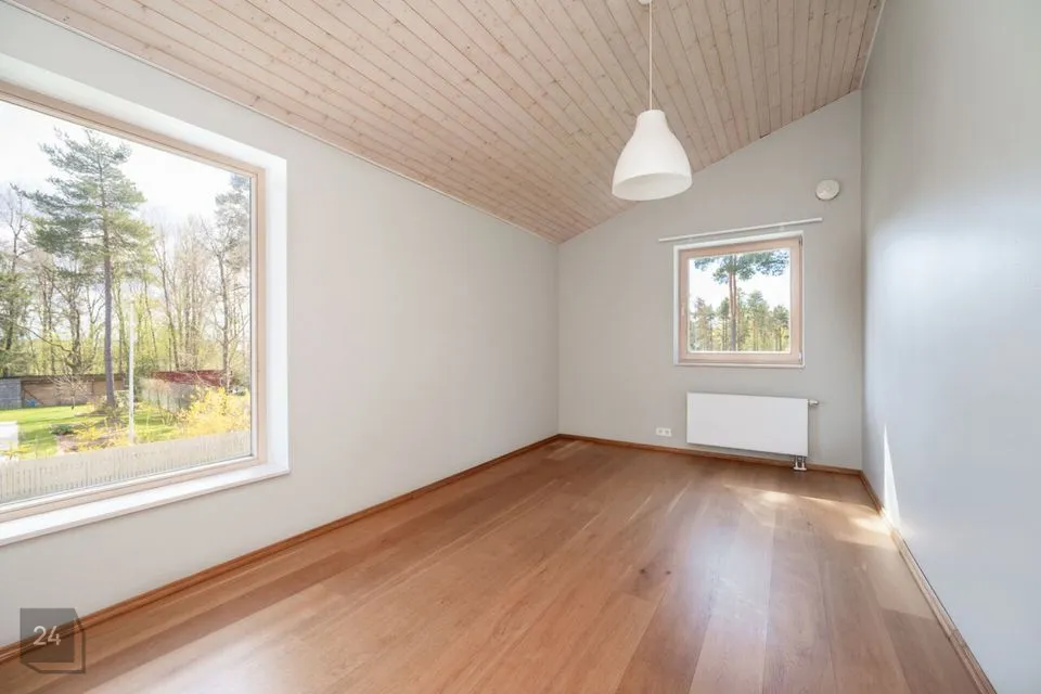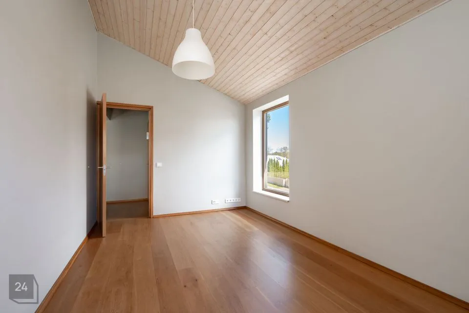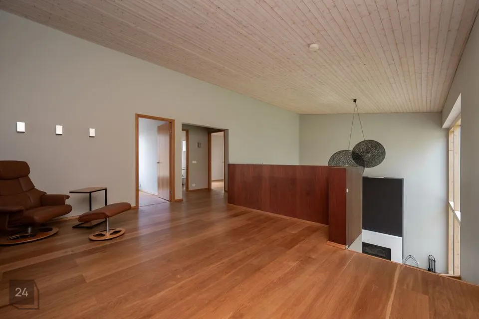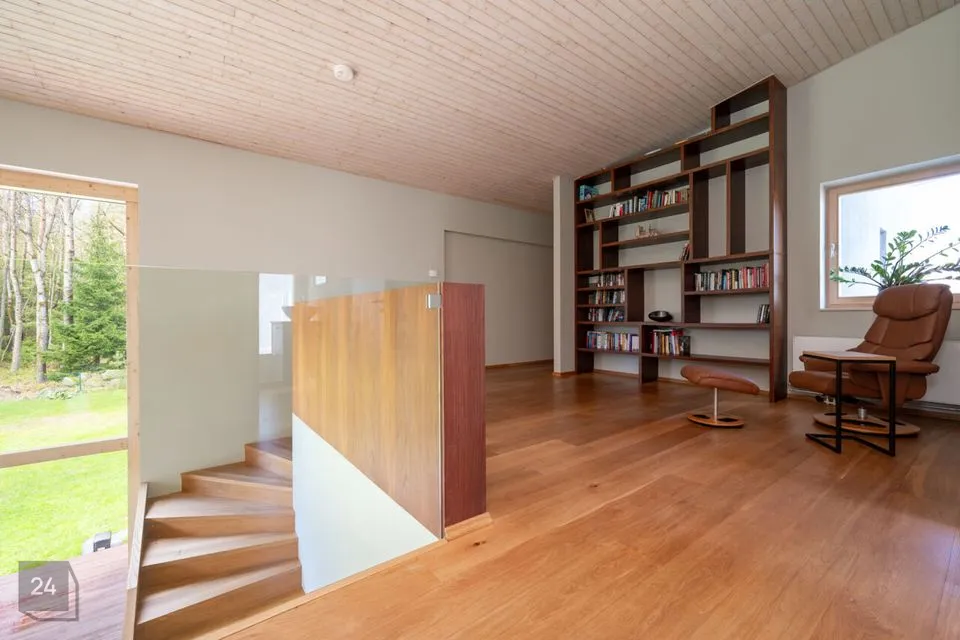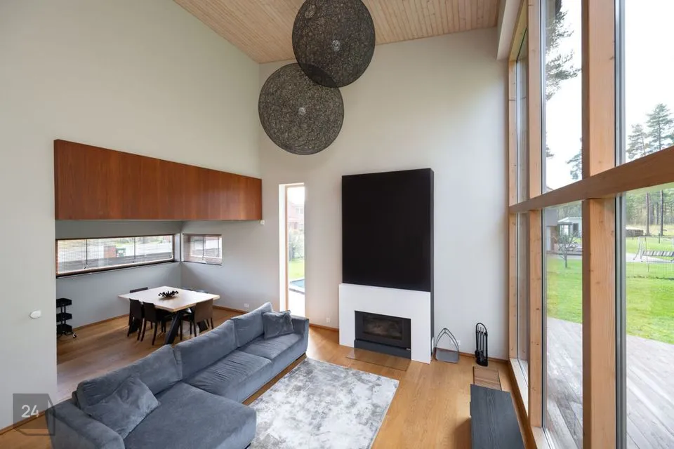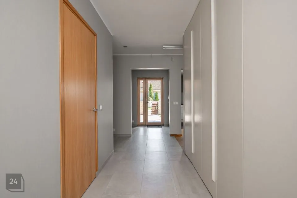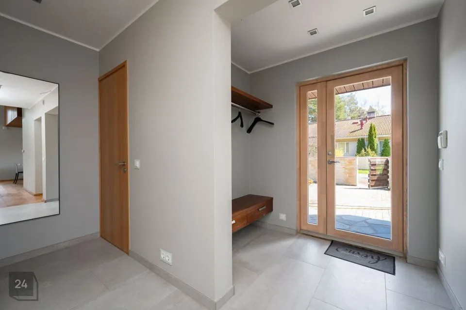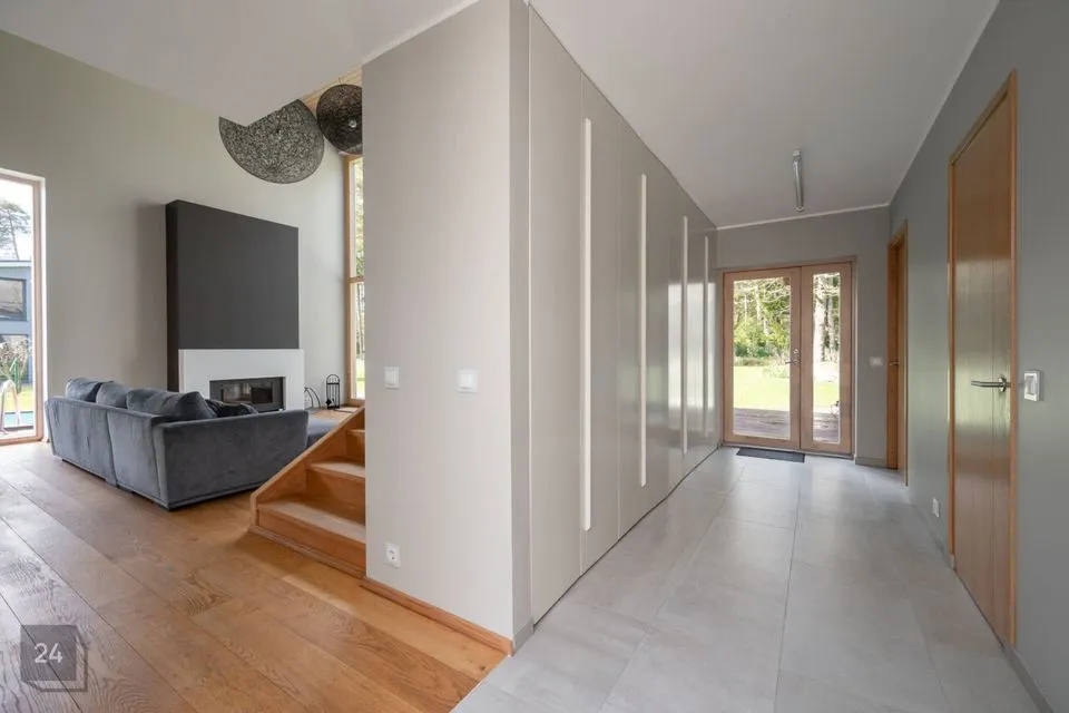Maja siseviimistlus ühendab maitsekalt heledad toonid ja naturaalse puidu, luues avara, valgusküllase ja hubase õhkkonna. Põrandaid katab soe tammeparkett, mis toob ruumidesse ajatut elegantsi. Esik on viimistletud suurte matthallide keraamiliste plaatidega, samal ajal kui köögis annavad iseloomu stiilsed tumedad plaadid.