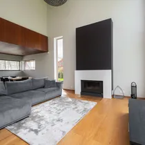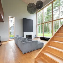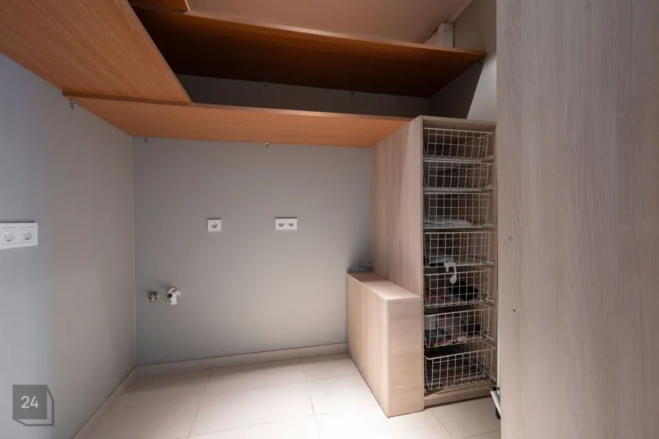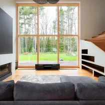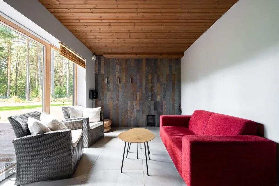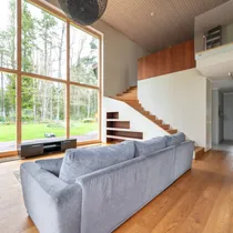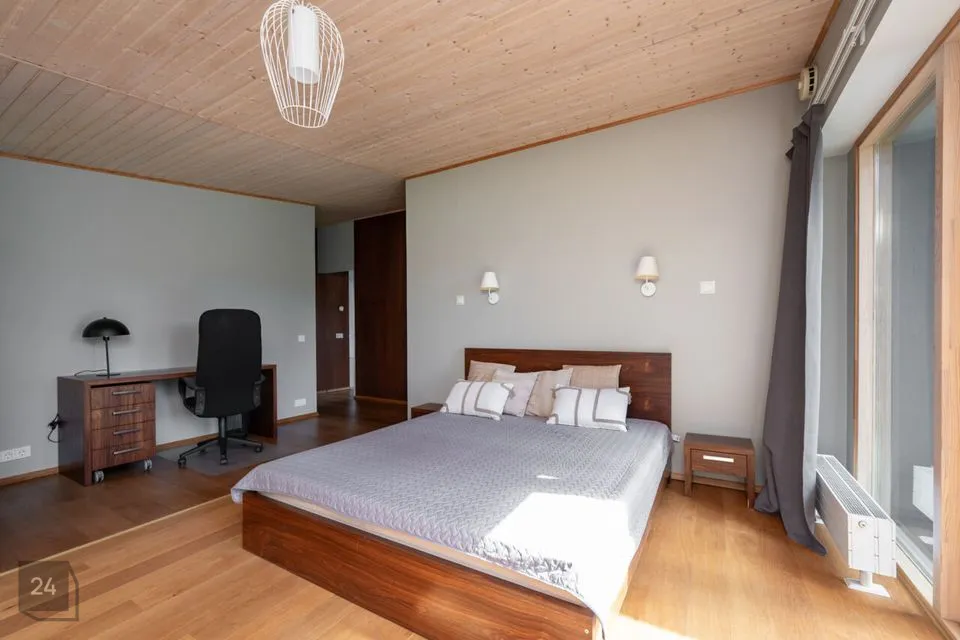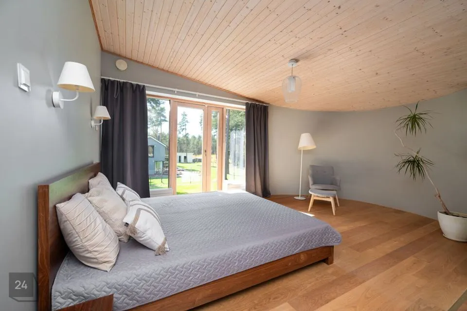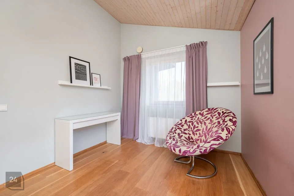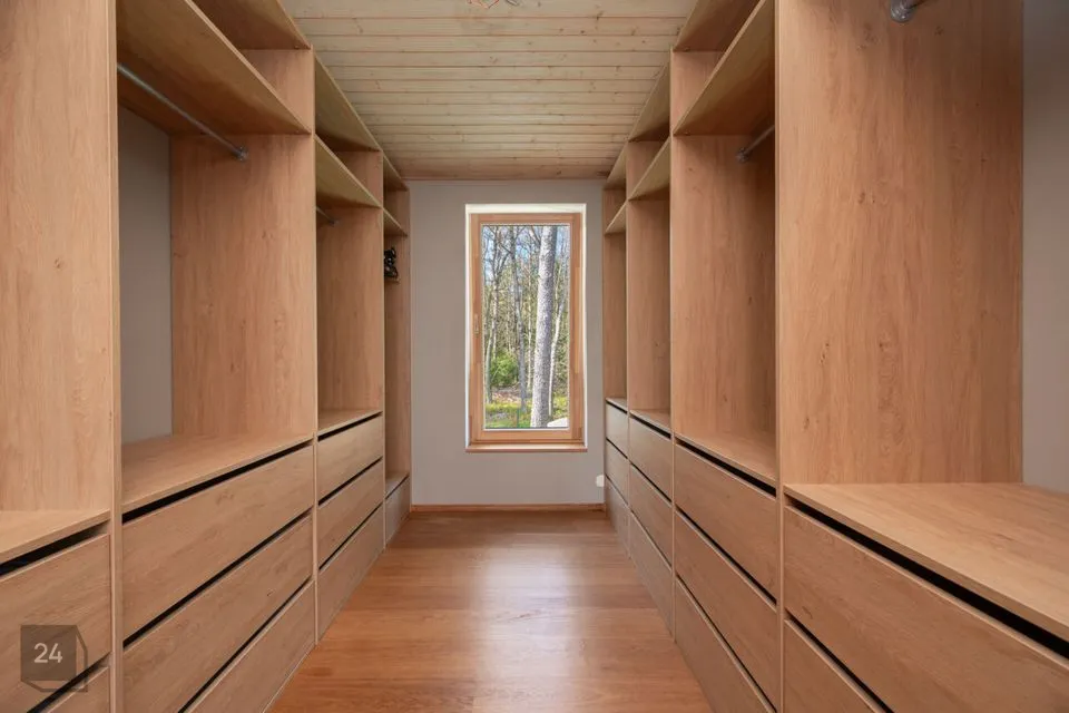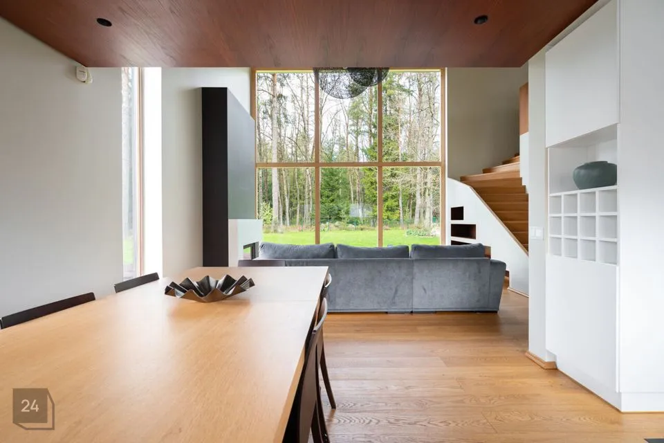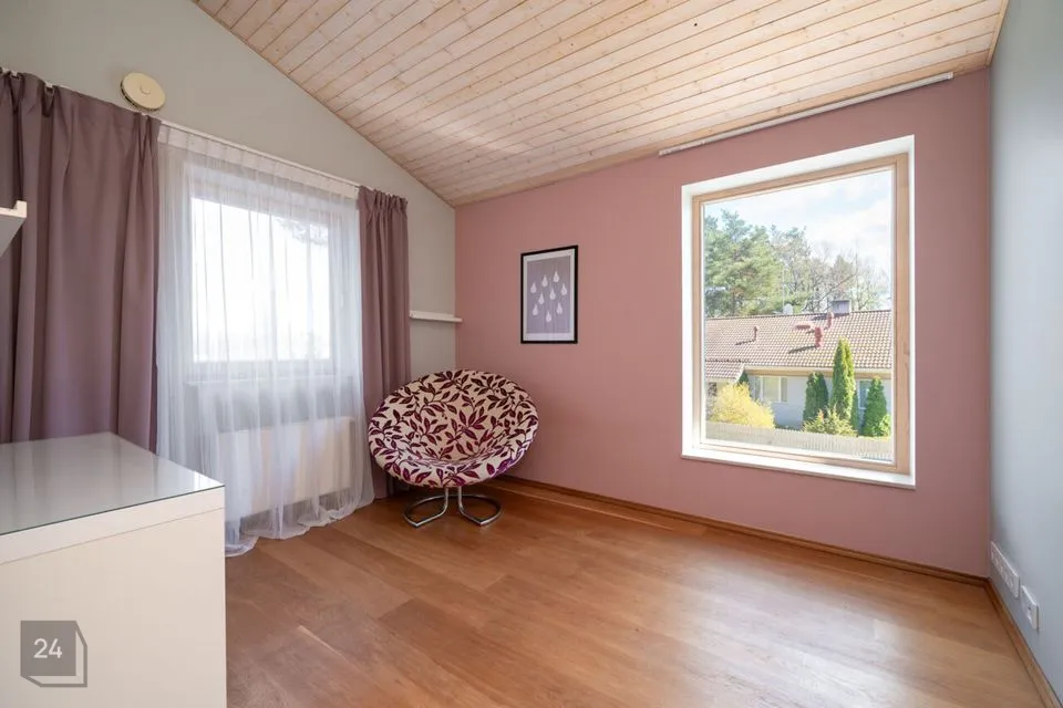 Maja siseviimistlus ühendab maitsekalt heledad toonid ja naturaalse puidu, luues avara, valgusküllase ja hubase õhkkonna. Põrandaid katab soe tammeparkett, mis toob ruumidesse ajatut elegantsi. Esik on viimistletud suurte matthallide keraamiliste plaatidega, samal ajal kui köögis annavad iseloomu stiilsed tumedad plaadid.