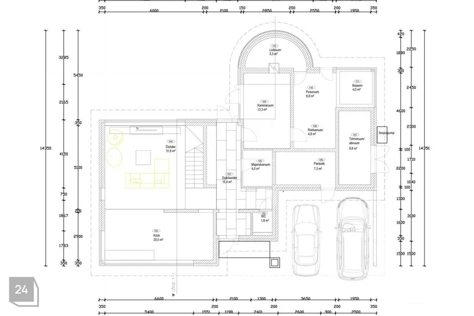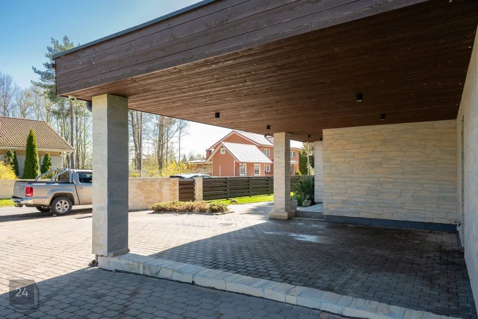 Sissesõidutee ja kahele autole mõeldud varjualune on kaetud stiilsete sillutuskividega, lisades hoovile viimistletud ilme. Soovi korral saab varjualuse hõlpsasti ümber ehitada kinniseks garaažiks.