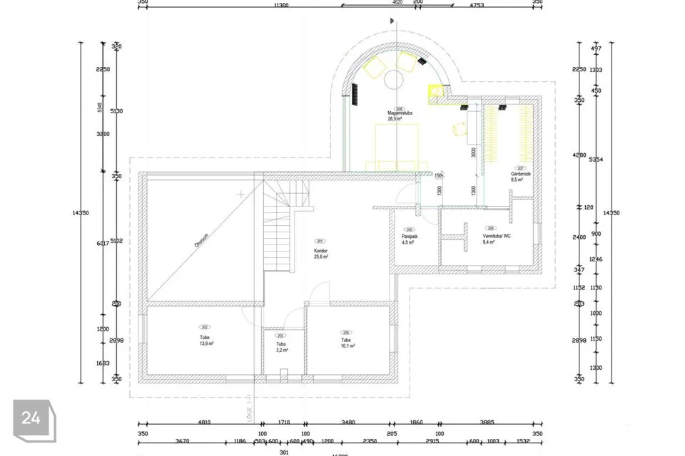 Maja 1. korruse koosseisu kuulub mahuka garderoobiga esik, külaliste wc, majapidamisruum, kaminaruum, pesuruum koos saunaga, kus asub ka maja sisene bassein ning avar ja valgusküllane elutuba-köök.