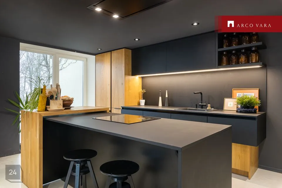 Esikust paremale jääb avar elutuba ja köök. Elutoast leiab suure toidulaua mis mahutab 10 tooli ja mugava diivani, kaks kohvilauda, kapi ja teleri koos sellealuse kapiga. Köögi osas on modernne integreeritud Aunmani köögimööbel, eraldi reguleeritava pikkusega köögisaar ja toidulaud 6 kohaga. Köögitehnikast on olemas külmik sügavkülmaga, elektripliit ja ahi. Köögist pääseb ka maja ees olevale merevaatega terrassile ja hoovi.
