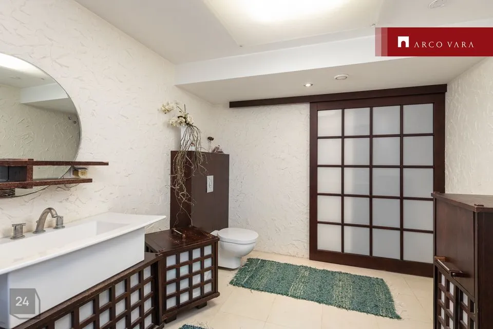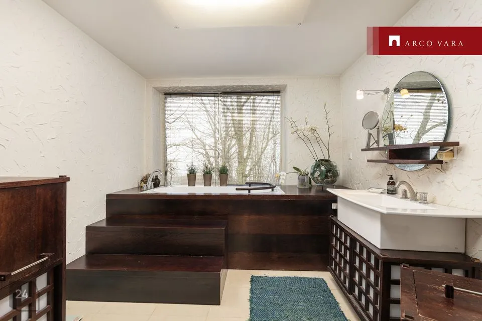 Liikudes treppidest edasi järgmisele korrusele, on seal väikese rõduga avar garderoobiruum, maja teine wc koos suure vanniga ning ilmeka vaatega merele. Samal korrusel on ka pesumasina ja kuivatiga pesuruum ning walk-in garderoobiga primaarne magamistuba. Magamistoas on suur voodi, kaks tugitooli, kaks öökappi, peegel ja meigilaud.