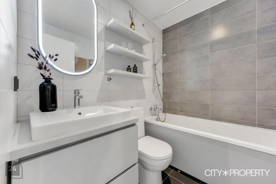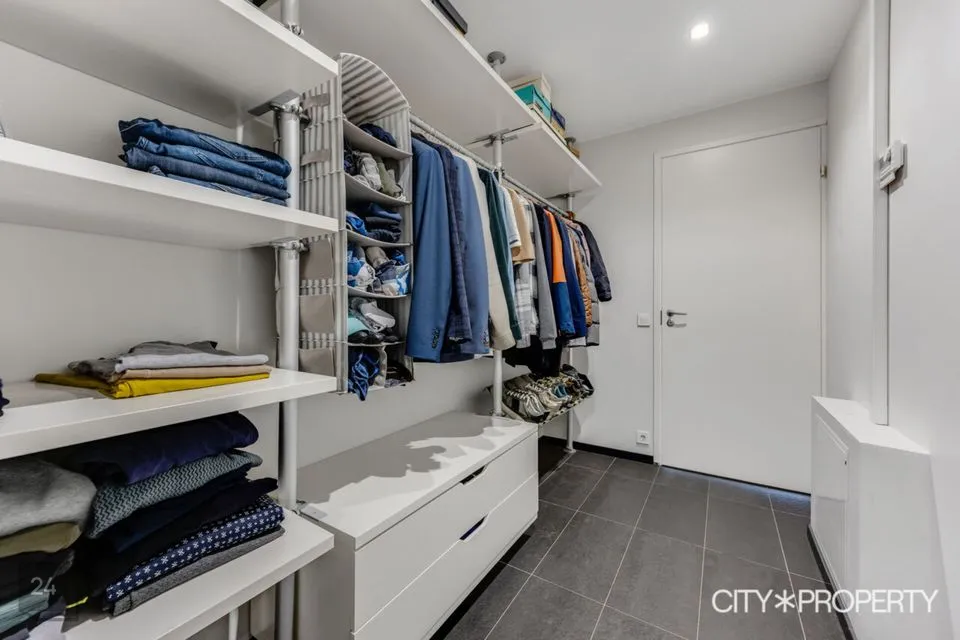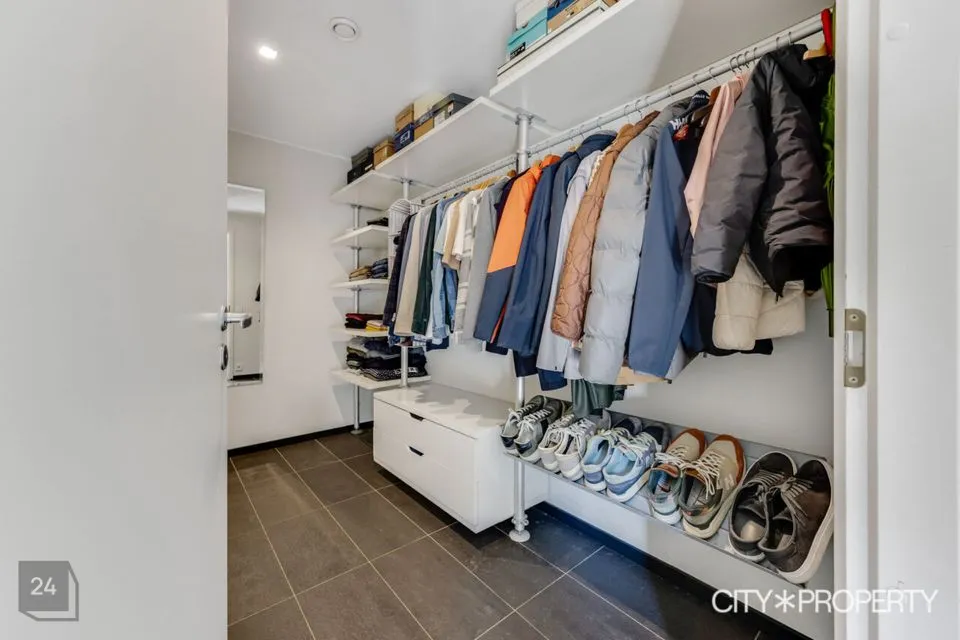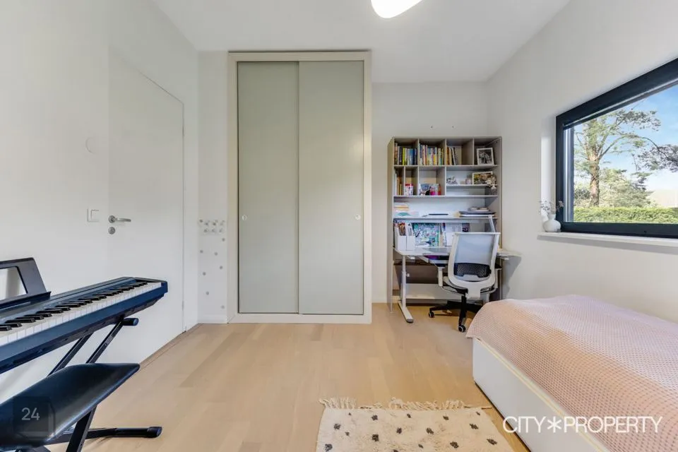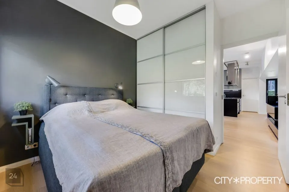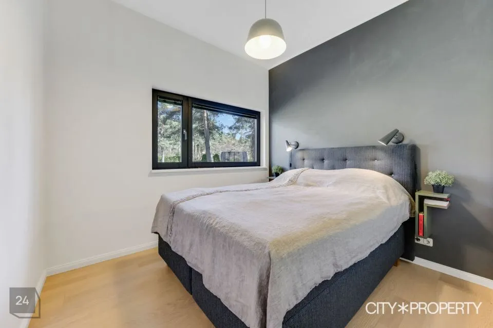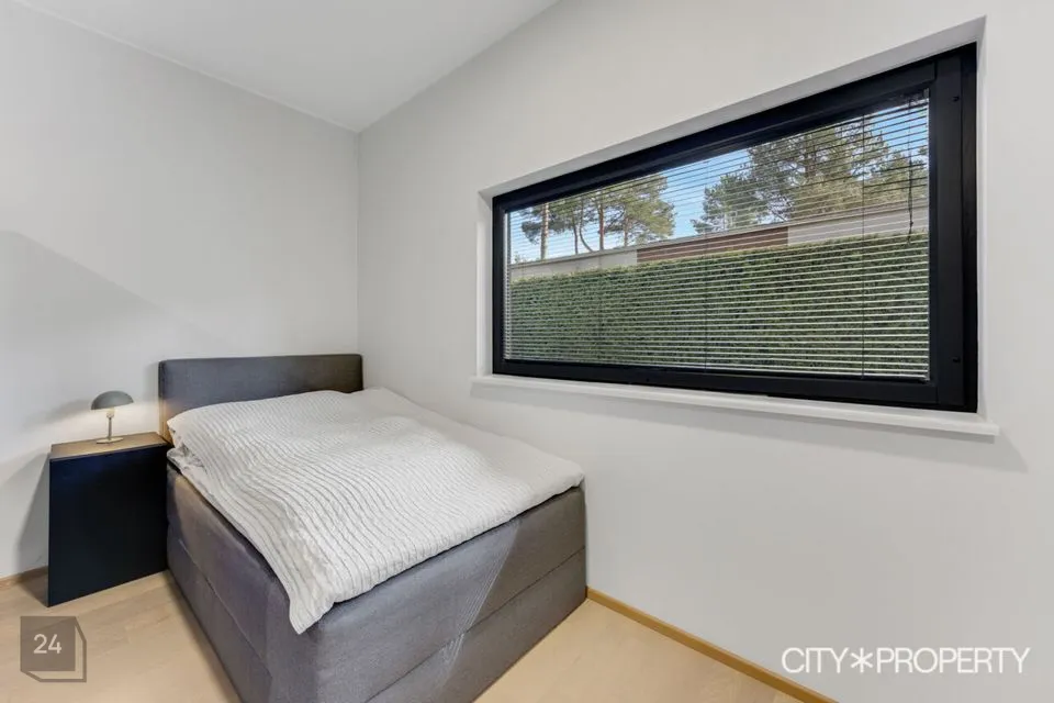 Magamistubades on mahukad sisseehitatud garderoobikapid. Siseviimistlus on heledates toonides, tuues esile ruumikuse ja hubasuse.