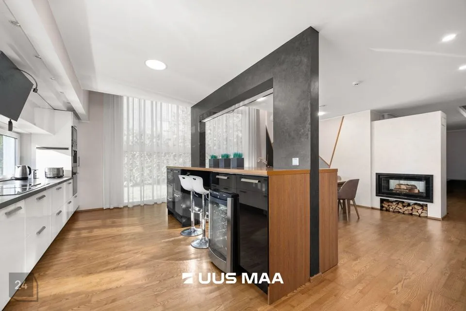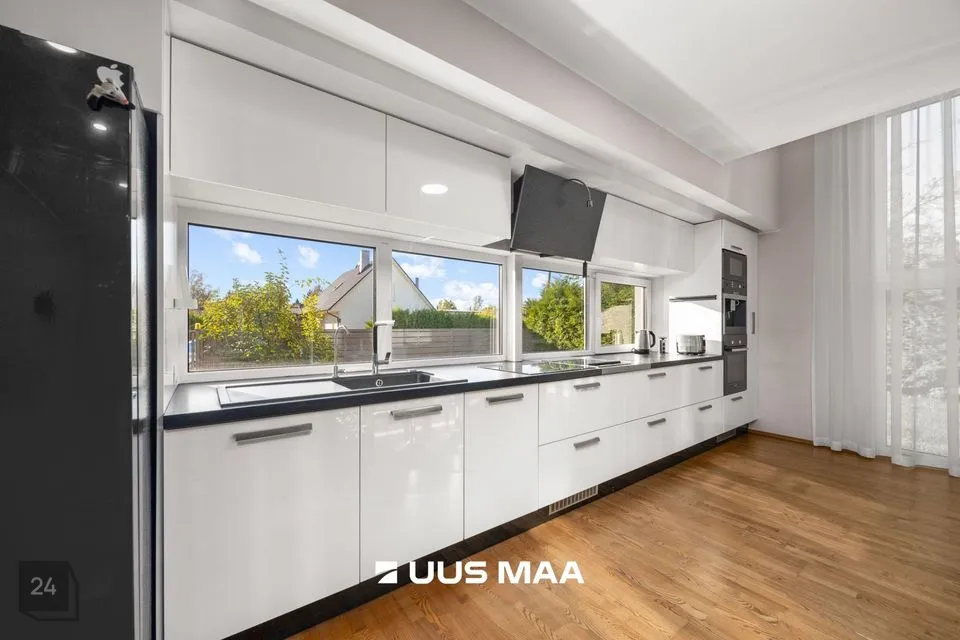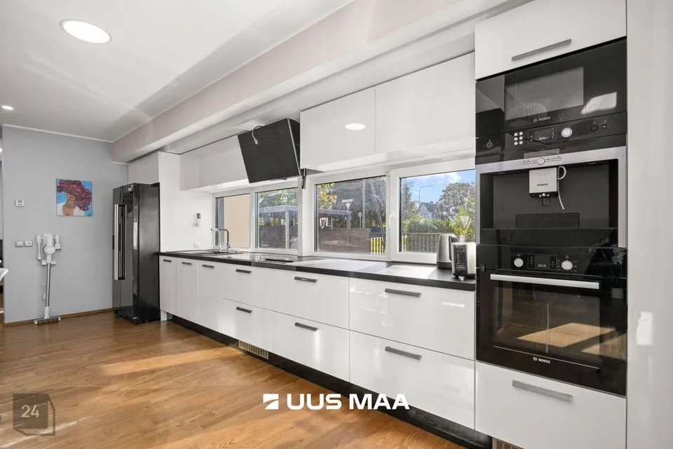 Köök ja tehnika: sisseehitatud mööbel ja kõrgtasemel seadmed (Siemens nõudepesumasin, Bosch külmik, induktsioonpliit)
