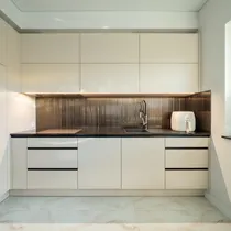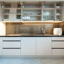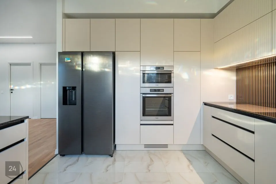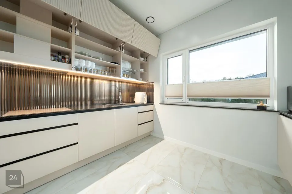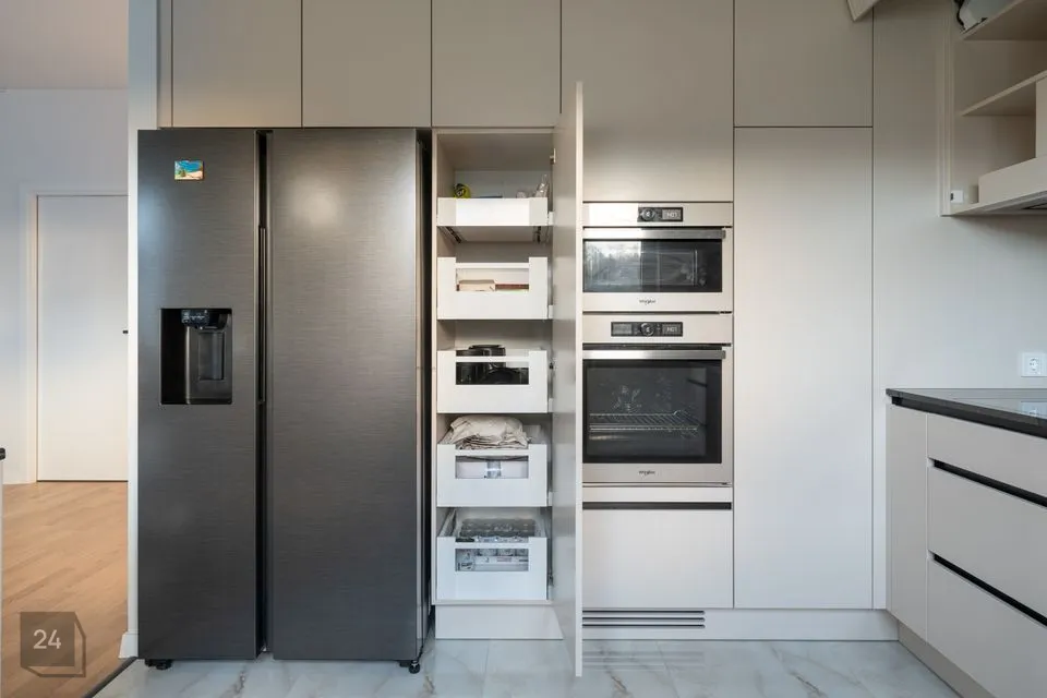 Köök graniitpinna ja nutikate riiulitega, mehaaniliste kapiustega