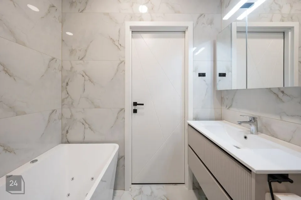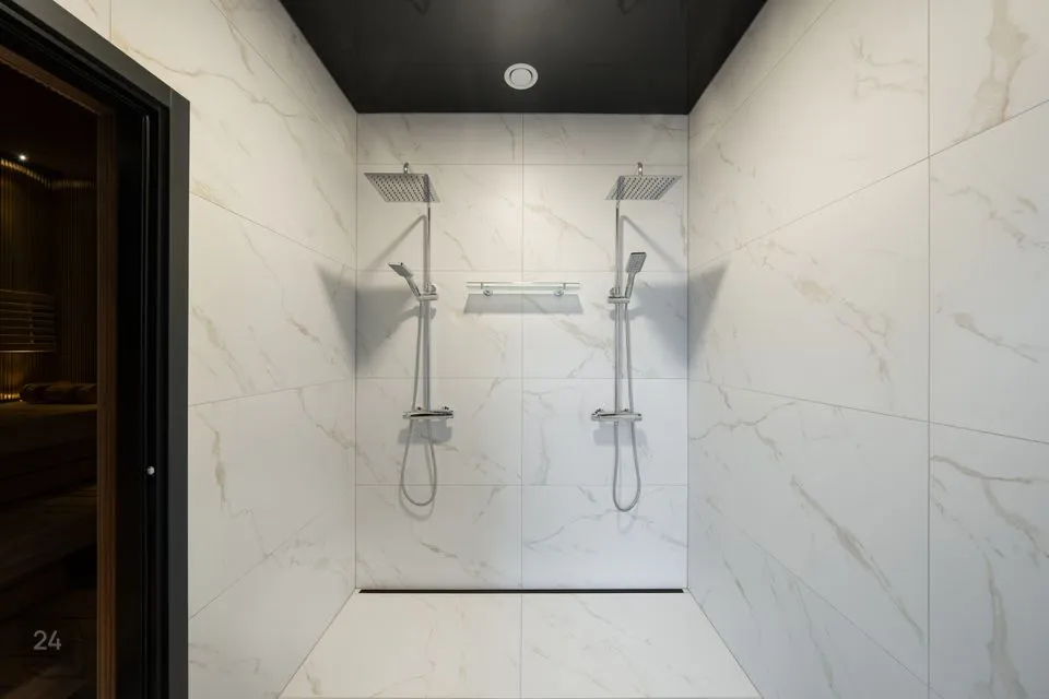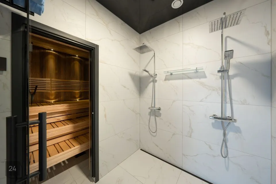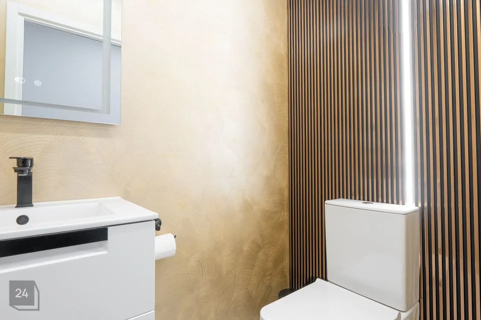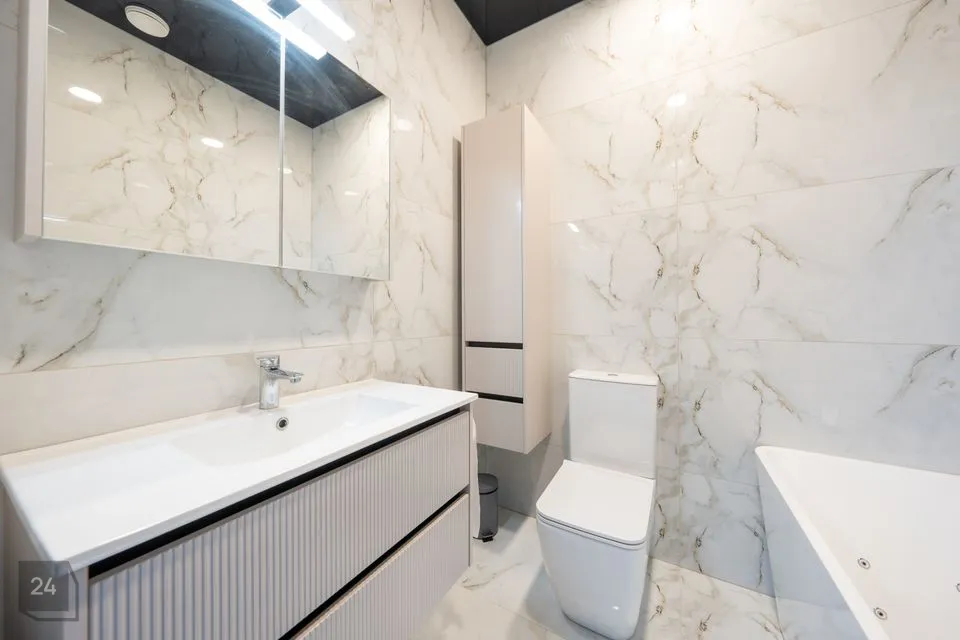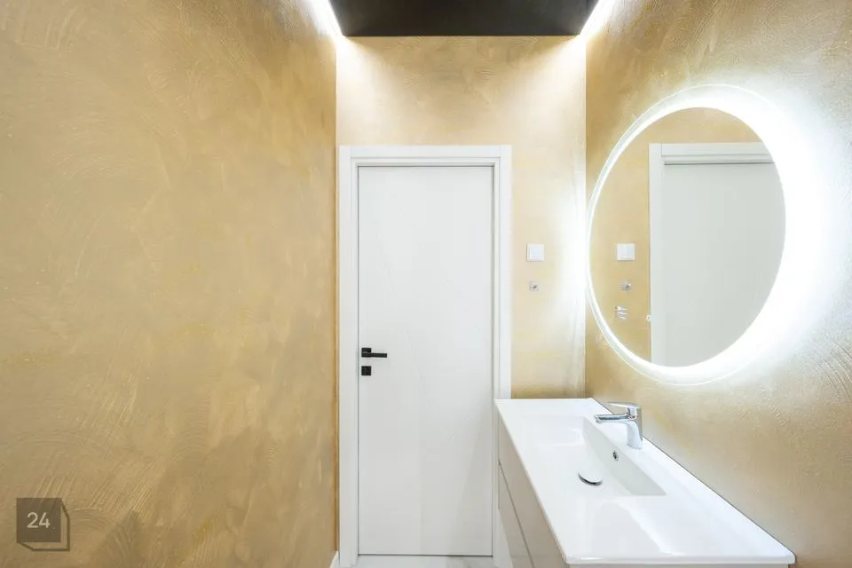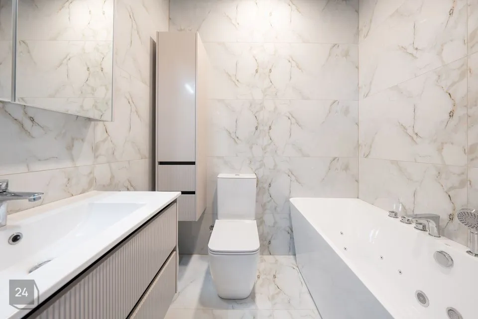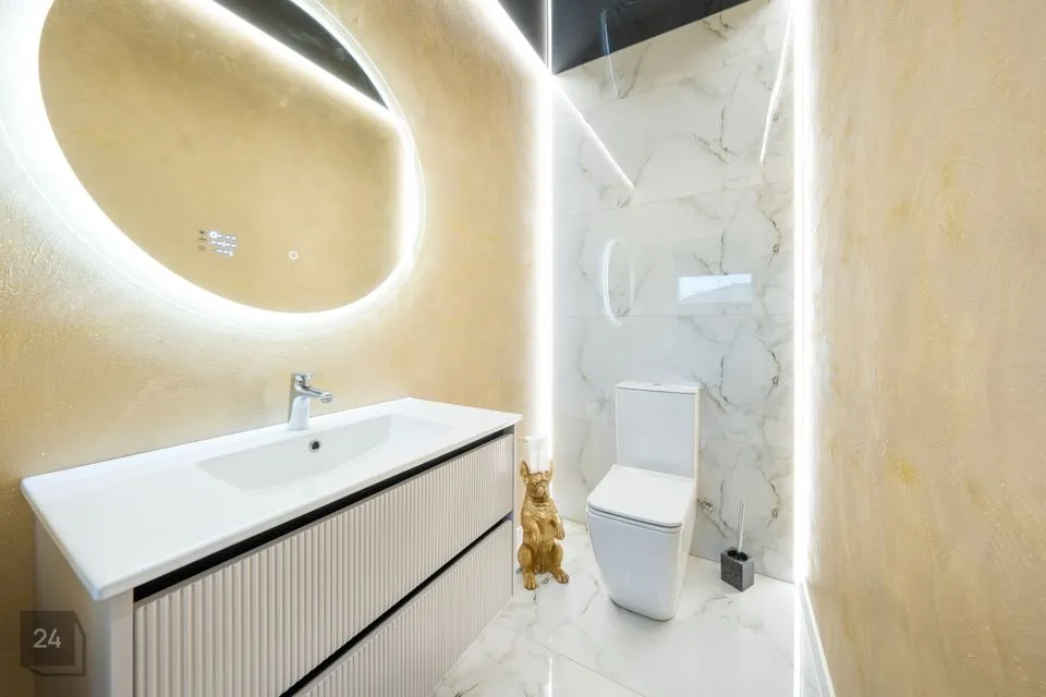 Kuldse tooniga sanitaarruumid, osaliselt marmormustrilised põrandad
