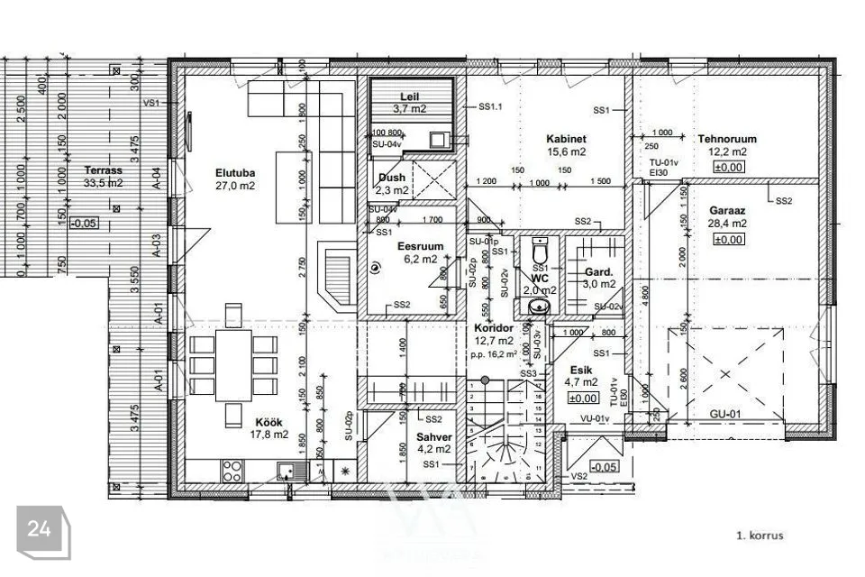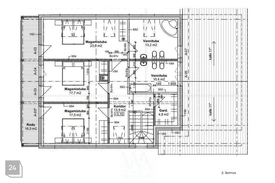 Elamispinda on 199,7 m², millele lisanduvad veel tehnoruum (12,2 m²) ja garaaž (28,4 m²).