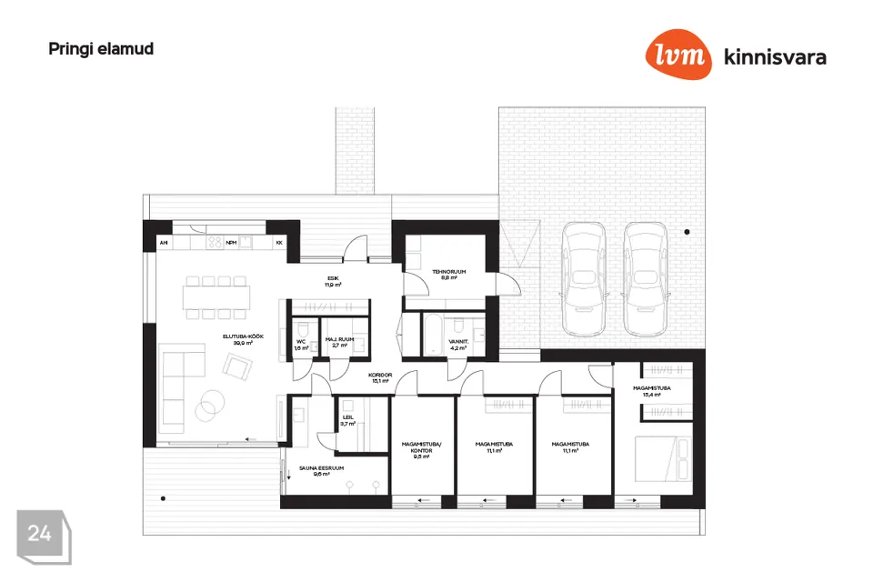 esik, kuhu saab sisseehitada kaks garderoobikappi; suur 39,9m2 avatud elutuba-köök, kust pääs avarale terrassile; wc; eraldi majapidamisruum; pesuruum koos leiliruumiga; kolm magamistuba; põhimagamistuba koos garderoobiruumiga; vannituba ning tehnoruum.