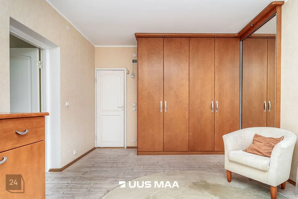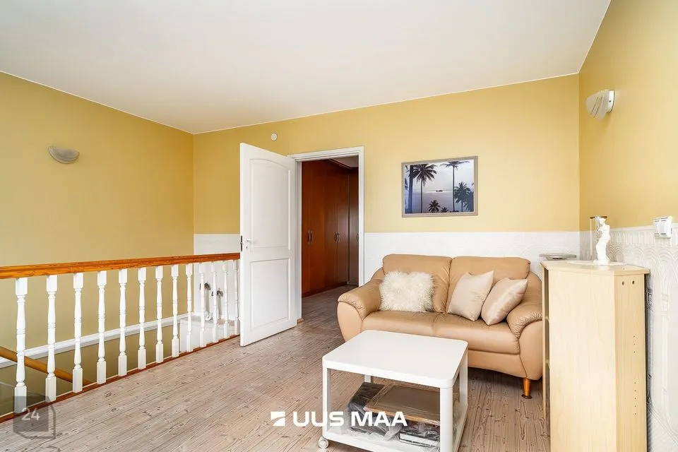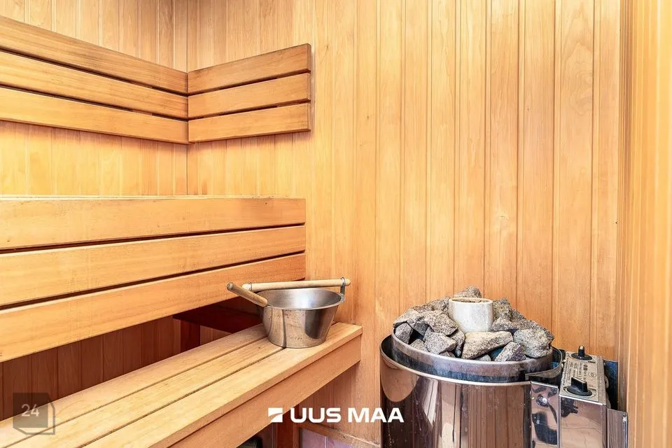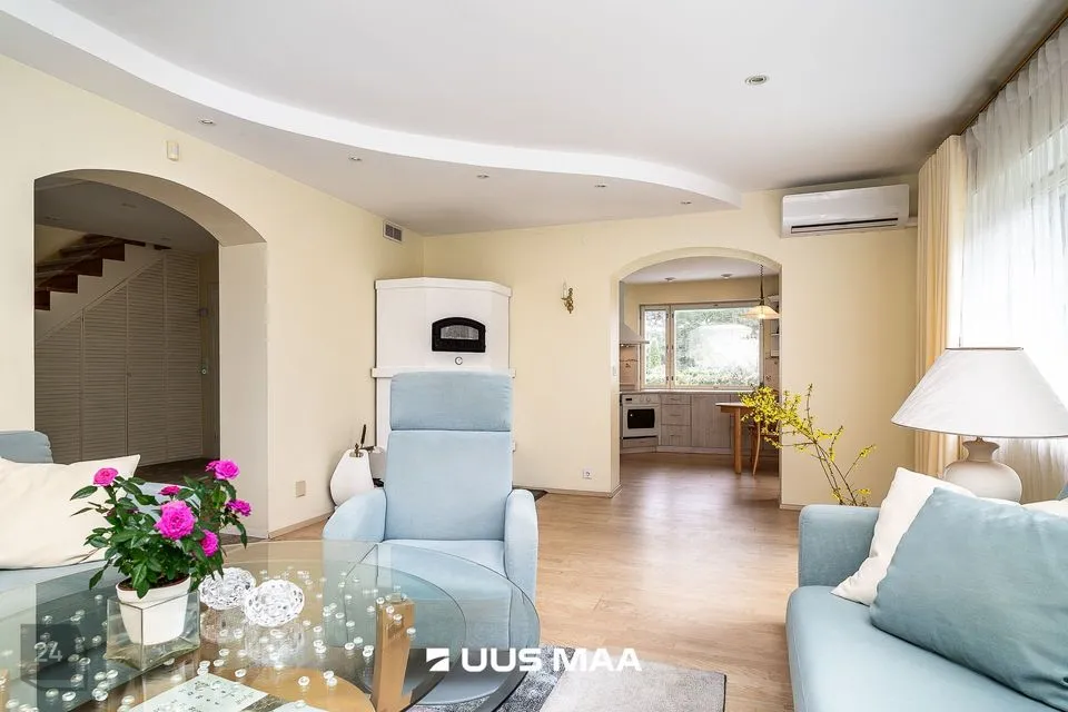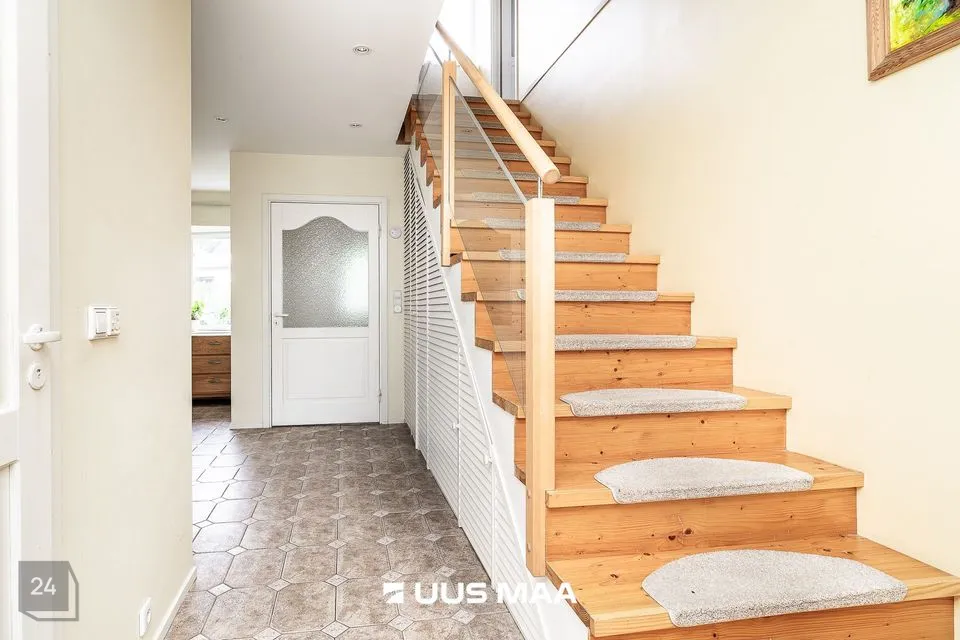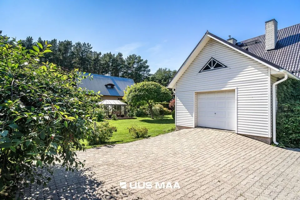 Elamu on kahekorruseline ja funktsionaalse ruumijaotusega. Esimesel korrusel paiknevad avatud köök ja elutuba, mille keskmes asub praktiline kamin-ahi – suurepärane lahendus, mis pakub soojust ning võimaldab soovi korral toitu valmistada ka elektrita. Köögist viib otsetee aeda, mis muudab suvised söögikorrad ja aiatoimetused veelgi sujuvamaks. Samal korrusel asub ka üks magamistuba, mis sobib hästi näiteks külalistele, töötamiseks või pereliikmele, kes eelistab elada ilma trepikasutuseta. Teisel korrusel paiknevad kaks magamistuba, avar trepihall ning täisfunktsionaalne saunakompleks, kuhu kuuluvad leiliruum, pesuruum, riietusruum, puhkenurk ning mullivann. Samalt korruselt pääseb ka rõdule, kust avaneb rahulik vaade haljastatud aeda. Tähelepanu väärib ka see, et magamistoa mööbel ja elutoa klaasist diivanilaud on valminud eritellimusel ja disaineri käe all, sobitudes elegantselt kogu elamu stiiliga.