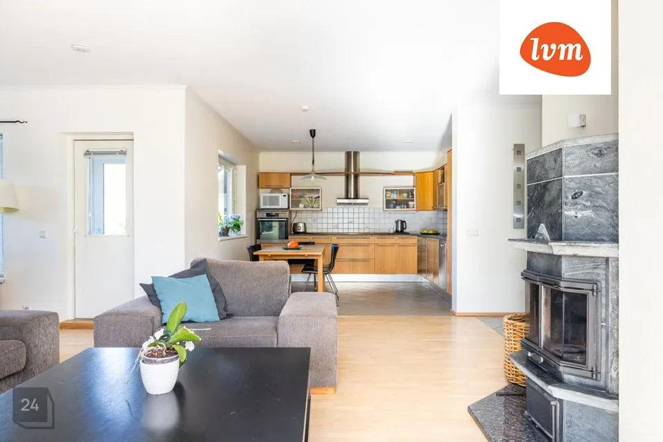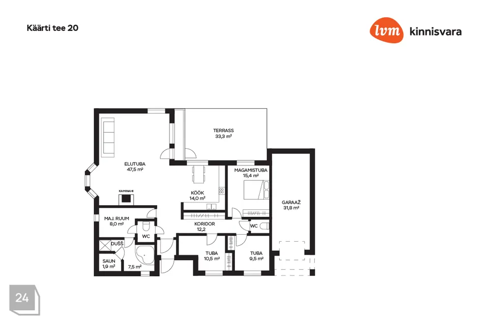 Funktsionaalse planeeringuga eramu. Esikuosa ehk tuulekoda, eraldi asetsev avatud köök einestamisalaga, väga avar elutuba (47,5m2), elutoast pääs majatagusele terrassile (33,3m2) mille esiosas ka klaasitud osa kus on mõnus varakevadet või hilissügist nautida, eraldi majapidamisruum, vannituba vanni, sauna ja dushinurgaga, kahelt poolt sissepääsuga eraldi paiknev tualett, vahekoridor mahuka garderoobiga ning kolm eraldi asetsevat magamistuba ja teine wc. Suletud garaaž 31,8m2.