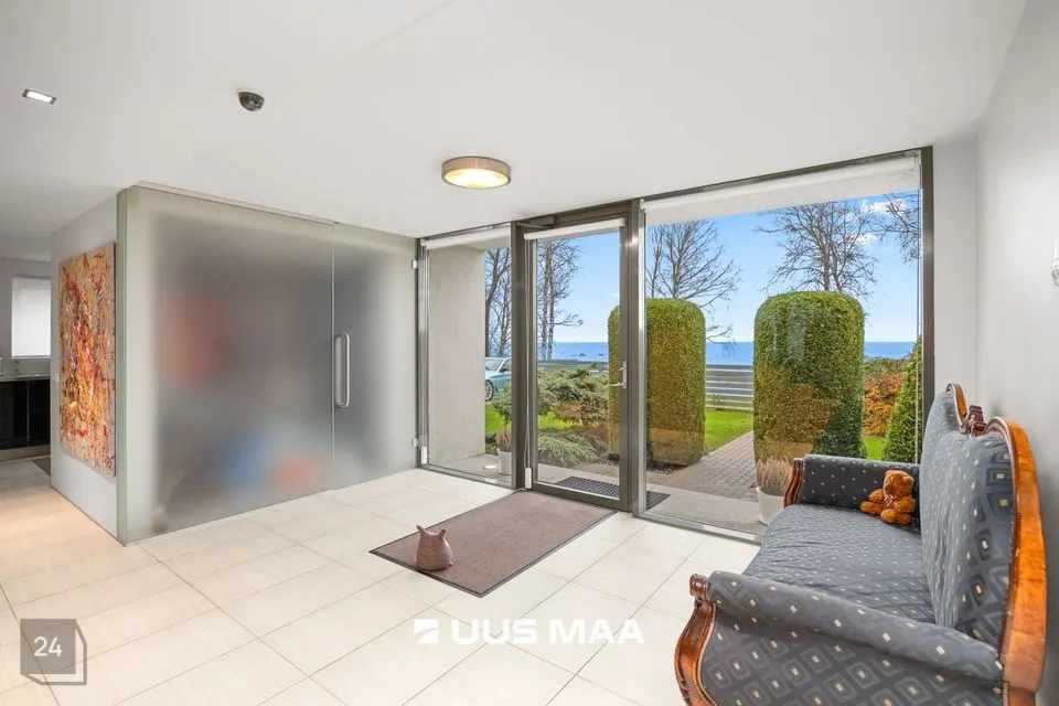 Esimesel korrusel tervitab avar elutuba, mille hiiglaslikud klaaspinnad avanevad otse merele ja terrassile.