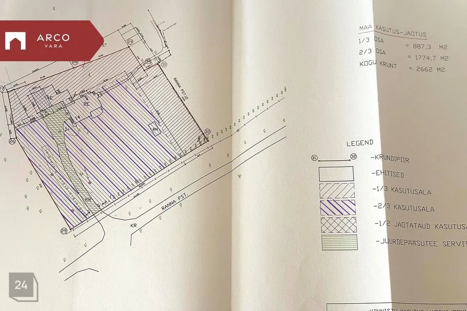 Müüdavale osale kuulub 2/3 kinnistust ehk kokku 1774,7 m². Lisatud ka jaotusplaani joonis.