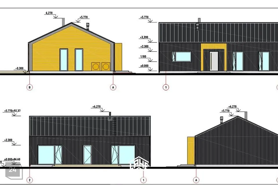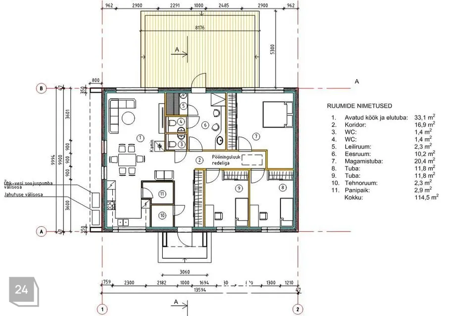 • Projekti järgi on hoonel 3 magamistuba, avatud elutuba-köök, pesuruum saunaga ja kuur.