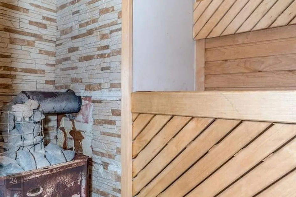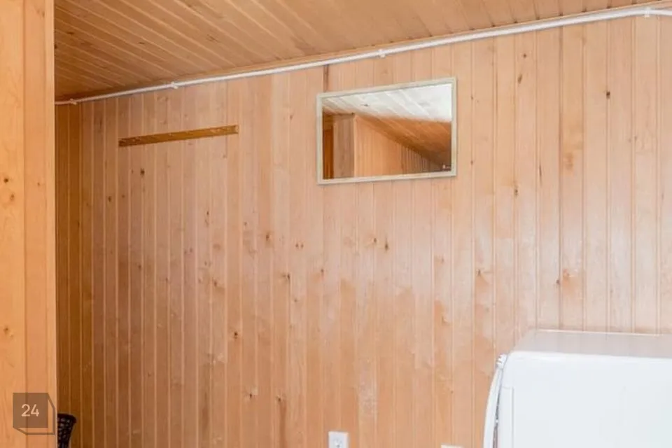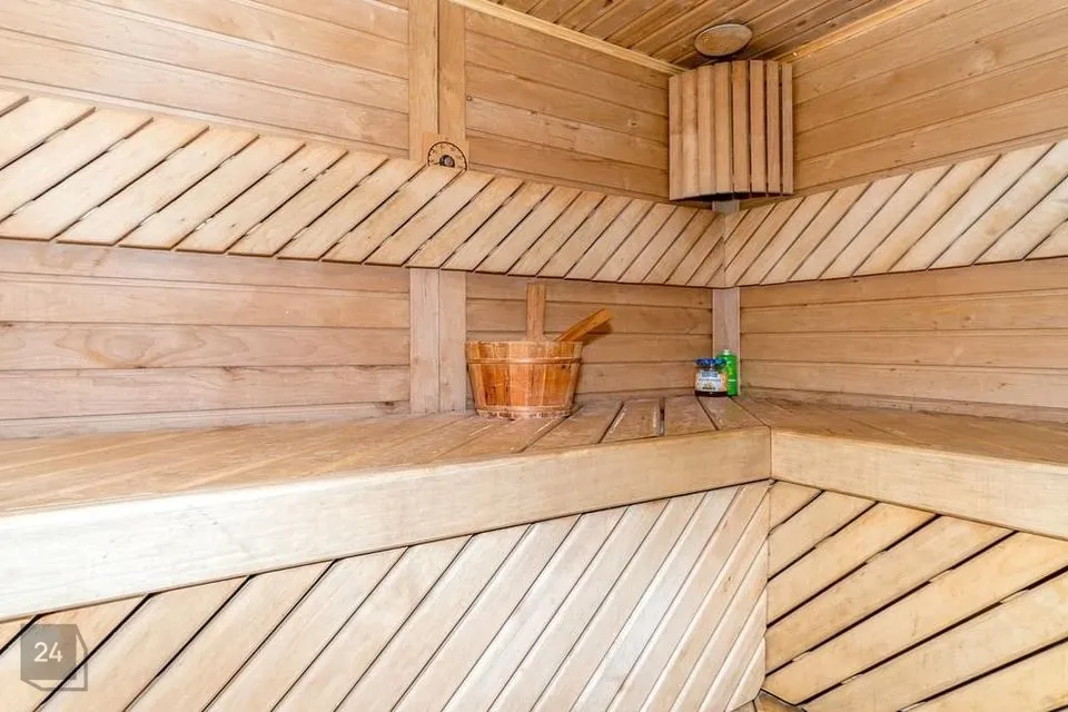 (Kõrvalhoones saun- saunas leiliruum, pesuruum, wc, ning puhkeruum. Puhkeruumis kamin ning pöös terrassile. Kõrvalhoone teine korrus on võimalik välja ehitada.)