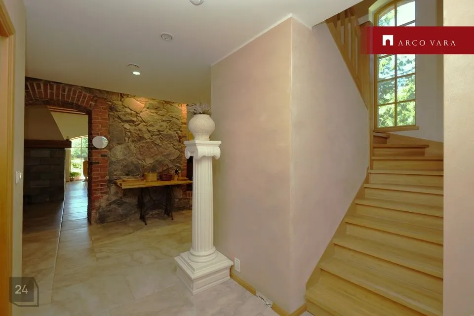 Siseviimistluses on kasutatud kvaliteetseid materjale: esimese korruse elutuba- köök- koridor on kaetud keraamilise plaadiga, söögitoa ja garderoobi põrandatel naturaalne tammelaud. Elutoas lisavad ajastu hõngu eksponeeritud maakiviseinad, laes esile toodud puittalad ning seintel kaunid vitraažvalgustid.