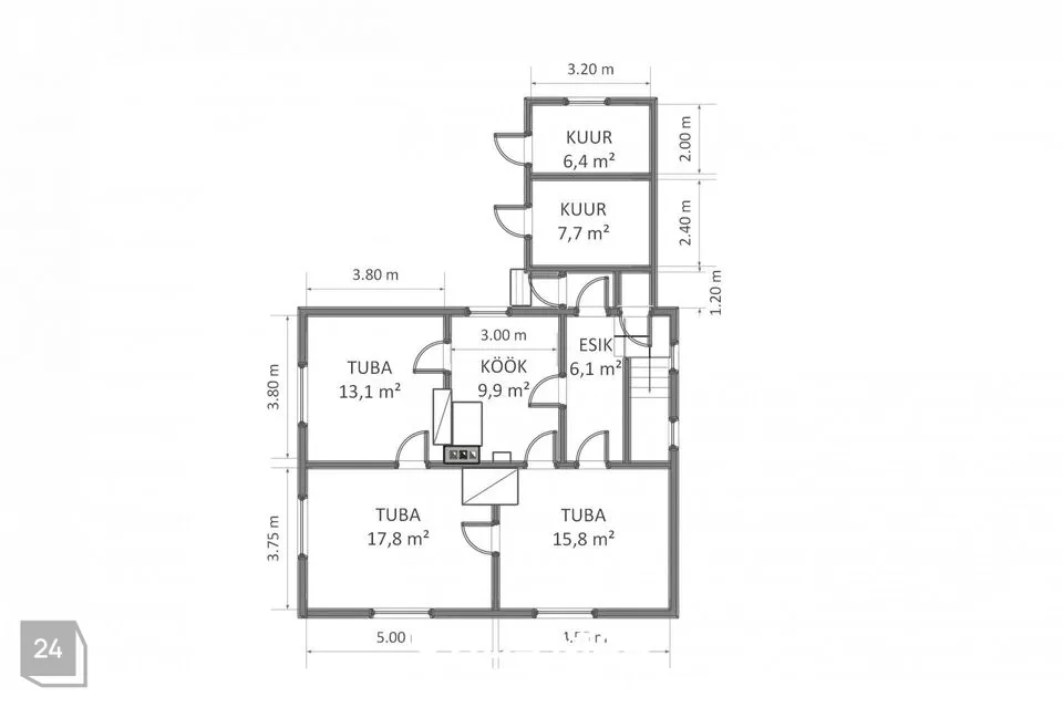 I korrus: esik, koridor, köök, 3 tuba, WC
