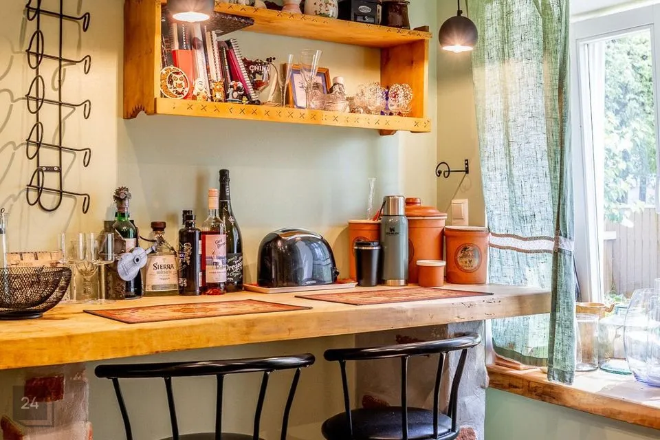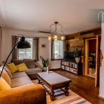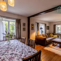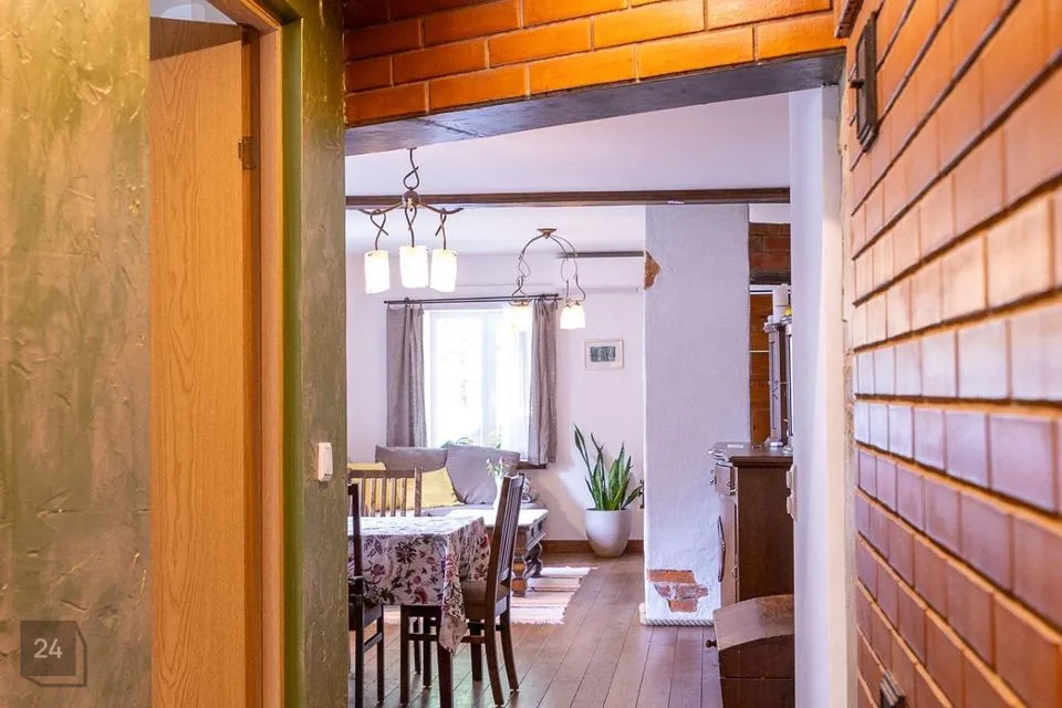Koridori lõpus on avar elutuba, mis on loodud ajastutruult, toodud sisse ka kaasaegseid elemente. Elutoas on ka kütteallikad – ahi ning õhk-soojuspump, millel on ka jahutus.