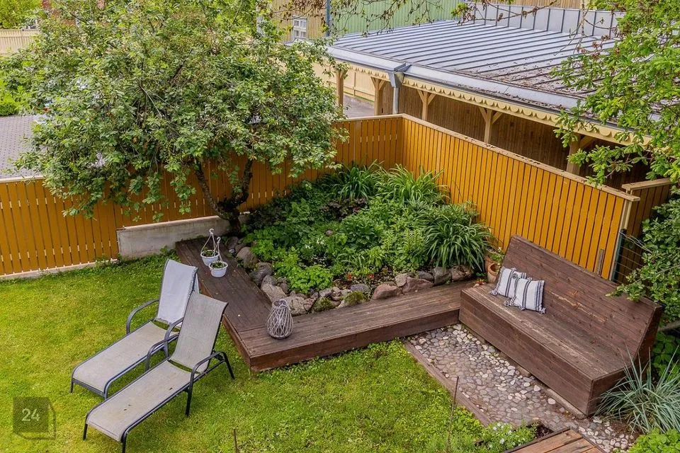 523 m² suurune kinnistu jaotub maja paremale ja vasakule küljele ning maja taha, kus asub 40 m² suurune päikese- ja valgusküllane terrass, mis asub vana vundamendi osa peal. Maja sissekäigu teel on punane tänavakivi.
