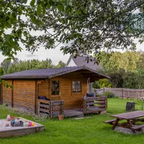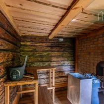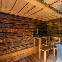 Saunaks on vanast saunast restaureeritud, 16 m² suurune palkhoone. Kütmine on traditsioonilsiselt ahjuga ja pesemine on olemas kausipesu näol. Sauna kõrval paikneb kohe väike ja kompaktne kuivkäimla.