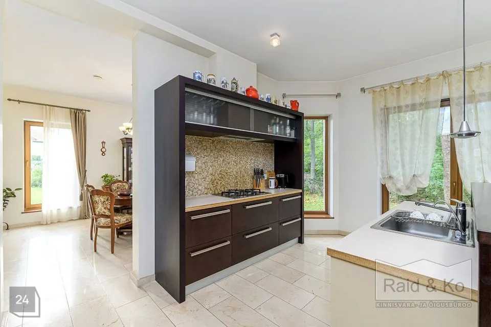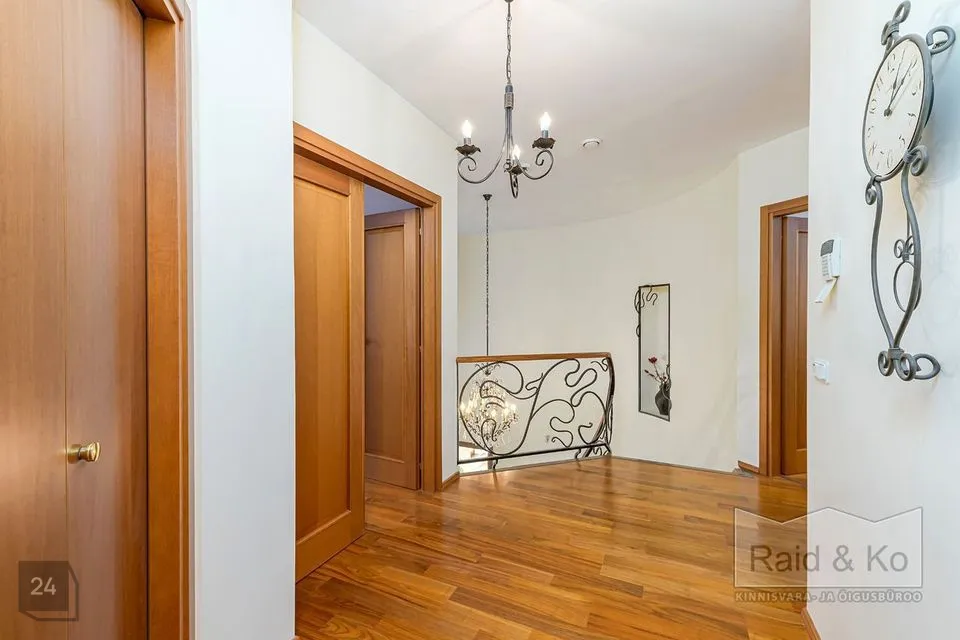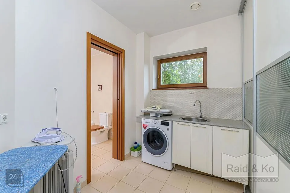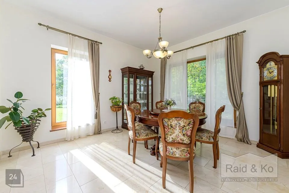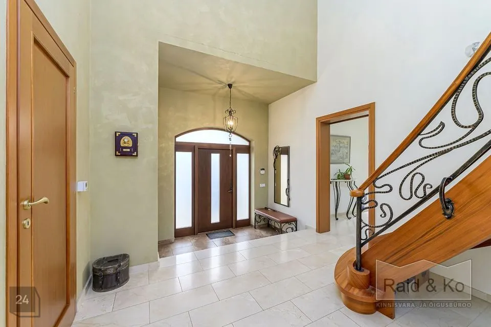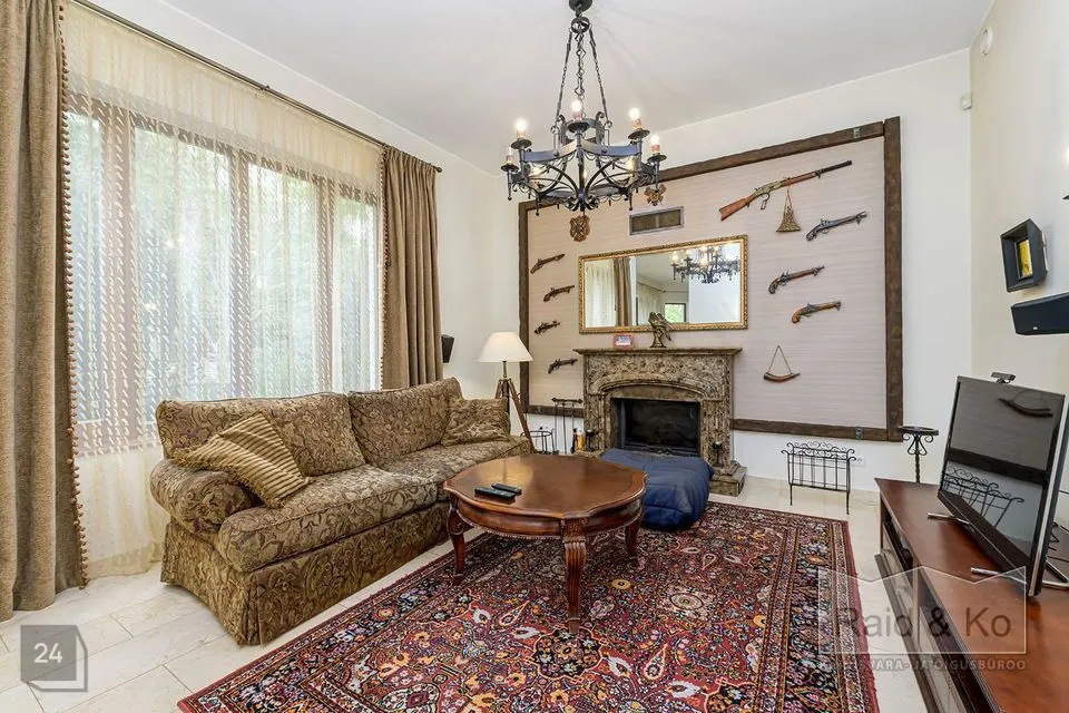 Majas on mugav ja hästi läbimõeldud planeering ning selle sisekujundus loob hubase ja harmoonilise atmosfääri. Sisenemisel tervitab teid kahekorruseline avar fuajee. Kõik ruumid sulanduvad loomulikult üksteisesse, rõhutades eluruumide terviklikkust - avar elutuba erkeriga, hubane söögiala, köök ja kaminatuba. Suured aknaavad tagavad maksimaalse loomuliku valguse. Köögist pääseb terrassile, kust avaneb vaade kaunile metsale. Esimesel korrusel asub ka avar ruum saunaga ja tualettruum. Teisel korrusel on kolm magamistuba, üks neist omab eraldi töökabinetti. Majas on suur vannituba eraldi ruumiga pesu pesemiseks, triikimiseks ja majapidamistarvete hoidmiseks. Majas on garaaž kahele autole ja tehniline ruum, samuti kolm pööninguruumi asjade hoidmiseks.