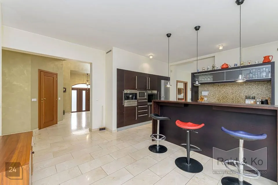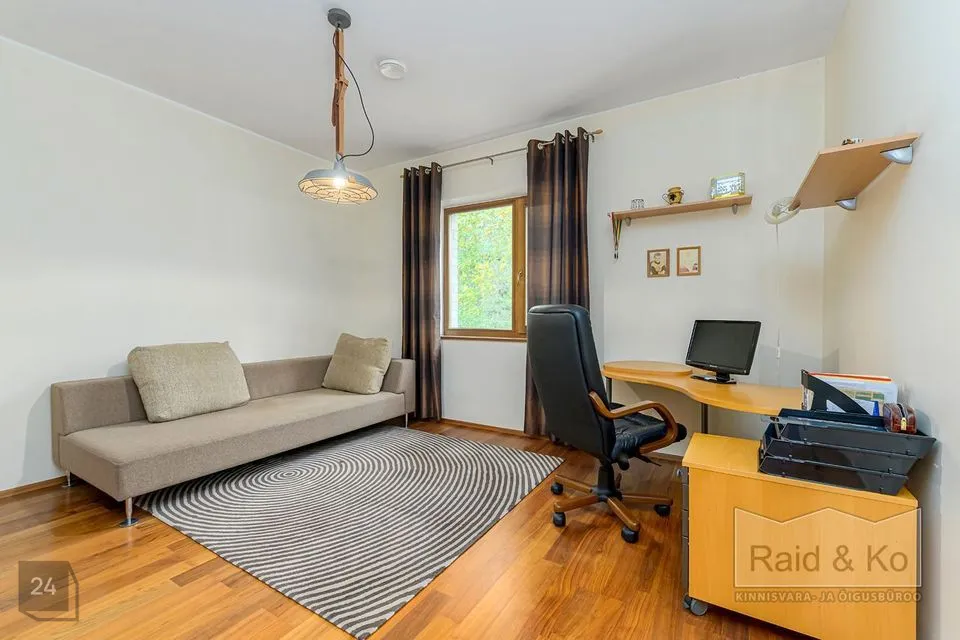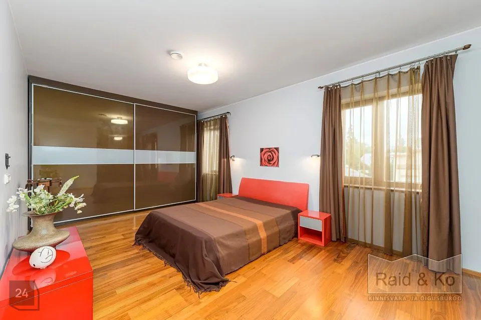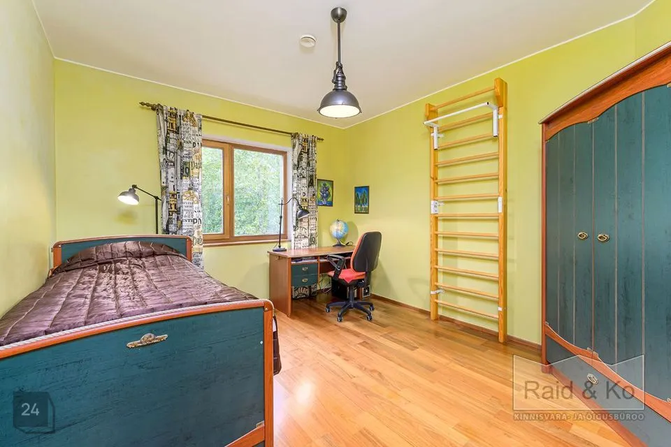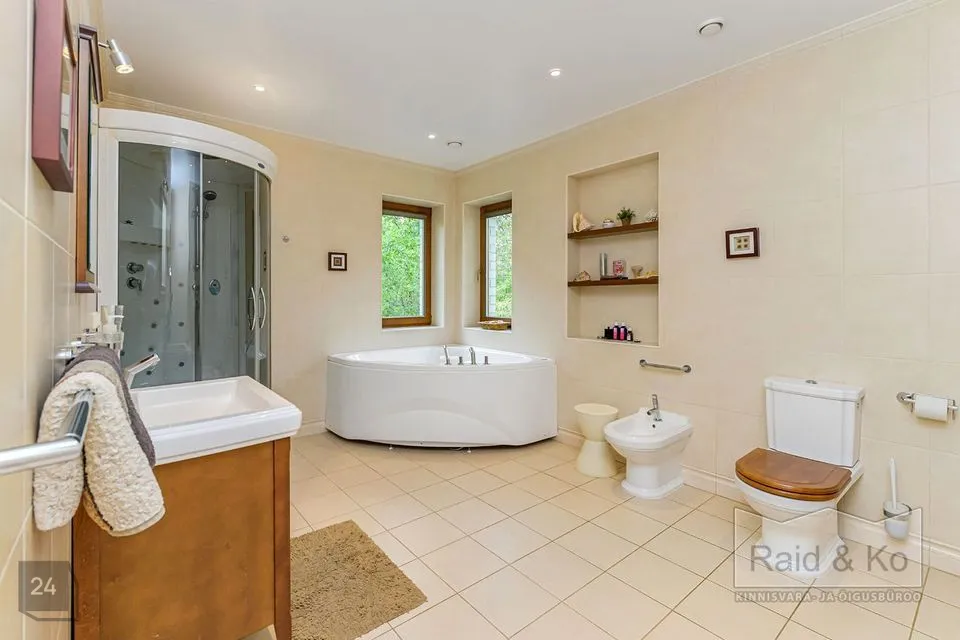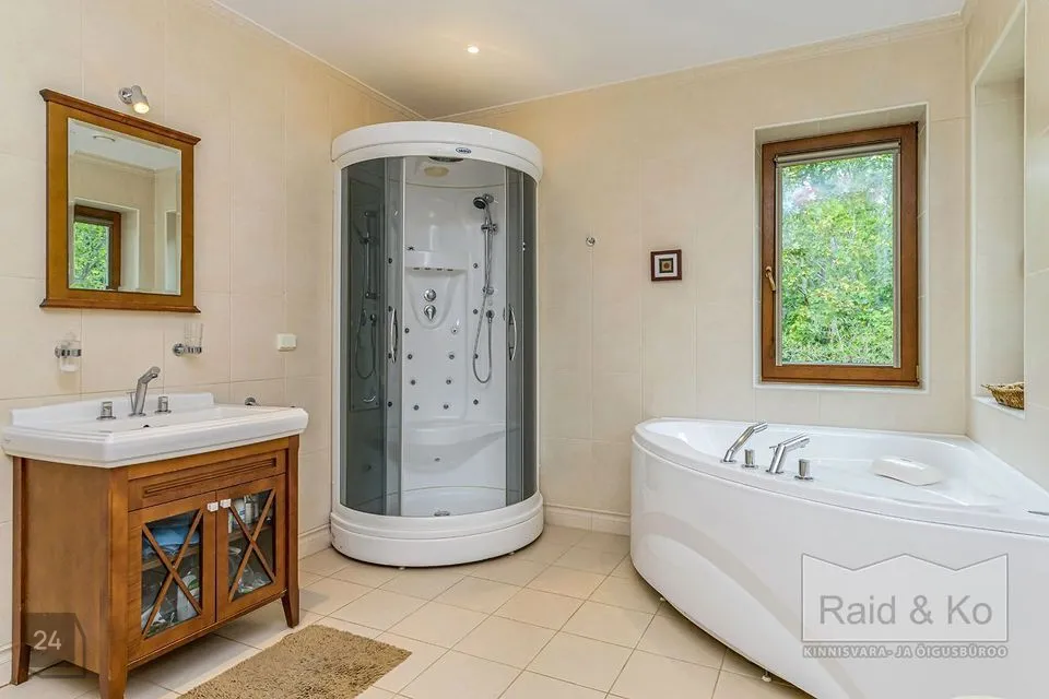 Majas on mugav ja hästi läbimõeldud planeering ning selle sisekujundus loob hubase ja harmoonilise atmosfääri. Sisenemisel tervitab teid kahekorruseline avar fuajee. Kõik ruumid sulanduvad loomulikult üksteisesse, rõhutades eluruumide terviklikkust - avar elutuba erkeriga, hubane söögiala, köök ja kaminatuba. Suured aknaavad tagavad maksimaalse loomuliku valguse. Köögist pääseb terrassile, kust avaneb vaade kaunile metsale. Esimesel korrusel asub ka avar ruum saunaga ja tualettruum. Teisel korrusel on kolm magamistuba, üks neist omab eraldi töökabinetti. Majas on suur vannituba eraldi ruumiga pesu pesemiseks, triikimiseks ja majapidamistarvete hoidmiseks. Majas on garaaž kahele autole ja tehniline ruum, samuti kolm pööninguruumi asjade hoidmiseks.