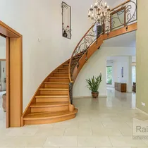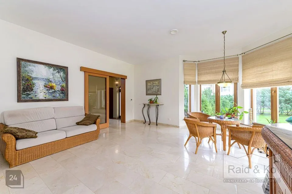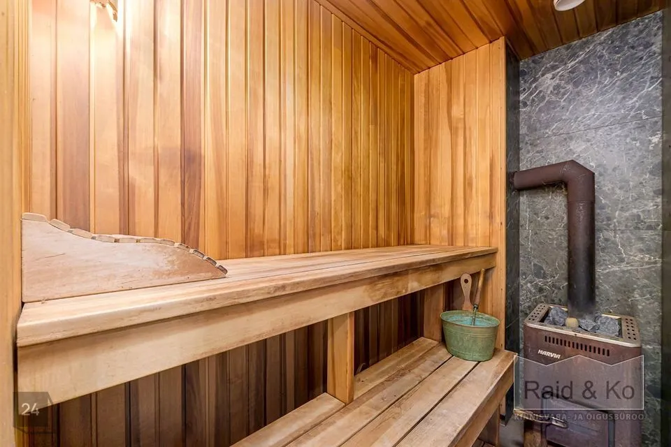 Esimesel korrusel on põrand kaetud Hispaania elevandiluu värvi marmorplaadiga (2 cm paksune) ning teisel korrusel on kasutatud Kanada pähklist spooniga 2-kihilist parketti. Kõik sanitaarruumid on kaetud Villeroy & Bochi keraamiliste plaatidega. Siseseinad on kaetud tsemendi-liivakrohviga ja värvitud heledates toonides, fuajees on kasutatud dekoratiivset krohvi. Eksootiline pähklipuust valmistatud keerdtrepp on kaunistatud sepistatud piiretega. Majas on sisseehitatud kamin, millel on Norra valualumiiniumist sisu ja Hispaania marmorviimistlus. Siseuksed, sealhulgas liug- ja kokkupandavad uksed, on valmistatud Itaalias pähklispoonist. Sauna viimistlus on termopuidust ning Harvia puiduküttel keris tagab mugavuse ja nauditava lõõgastuse.