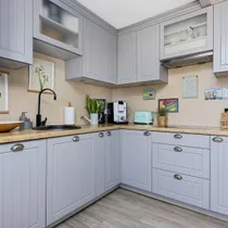 Köögis on kaasaegne hallis toonis köögimööbel koos kvaliteetse tehnikaga, nõudepesumasin, keraamiline pliit, ahjud ja külmik.