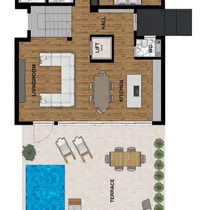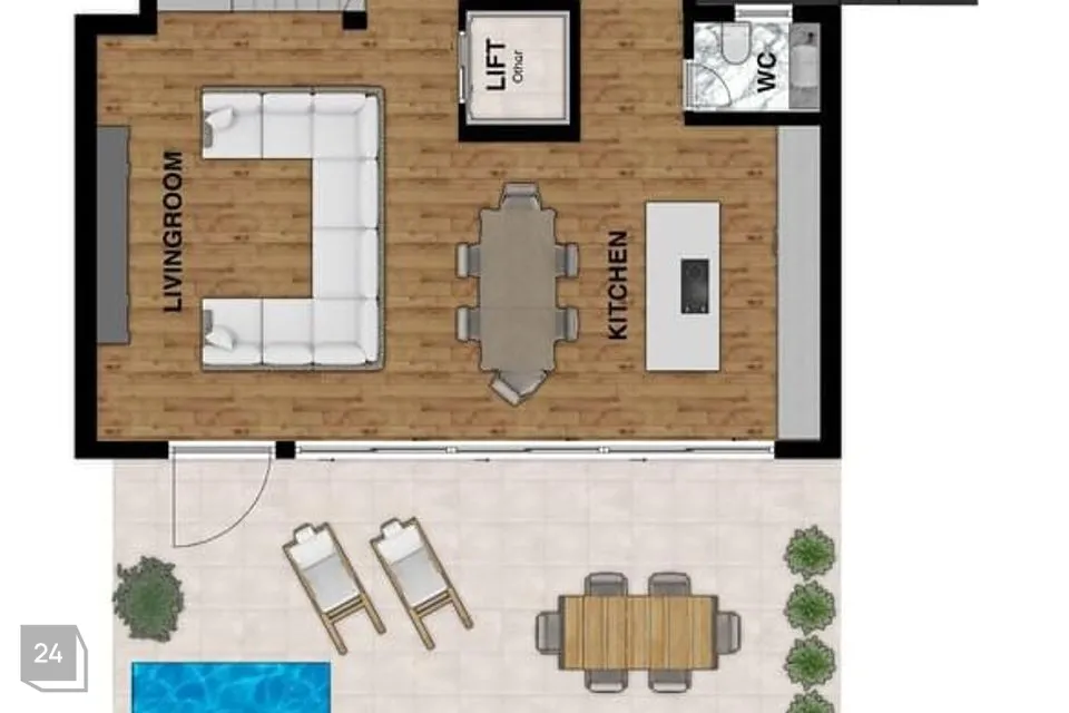 Elamu on kolme korruseline modernses stiilis luksuslik villa, kus õueterrassil paikneb 3x10m välibassein.