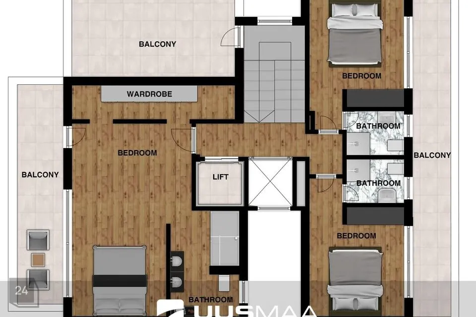 Hoonel on terrasside kaetud ala kokku 240,0m2. Hoone korruseid ühendab hoone sisene trepp ja lift, mis sõidab välja kuni viimase korruse katuseterrassini.