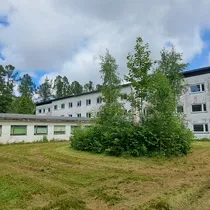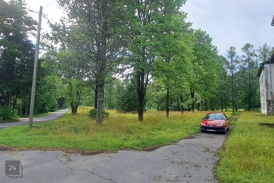Hoone ümber on asfalteeritud teed ja parkimisplatsid kummalgi pool elamut.