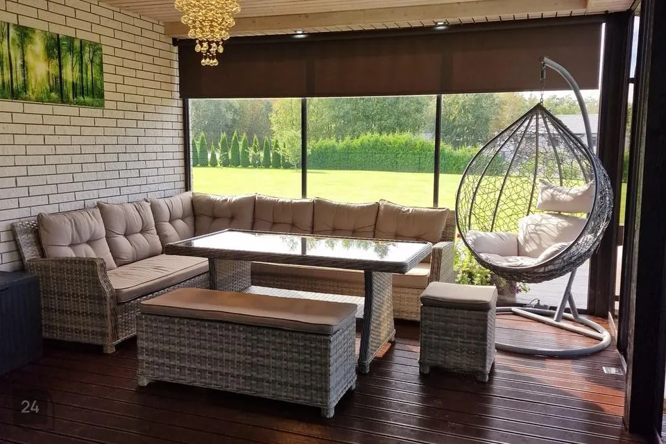 Vasakpoolsesse majapoolde ehk lõuna ja õhtupäikese poole jääb 120 m2 suurune terass, millele ligipääs on suurest puitalumiiniumist kahepoolsest uksest. Köögimööbel on valmistatud eritellimusel milles on kvaliteetne Boschi tehnika. Kööki ilmestavad suured aknad, hele plaaditud põrand ning must kivitasapind. Elutoas on suured aknad vaatega terrassile ja hoovialale ning pääs terrassile. Elutoas olev suur söögilaud on kaetud valge kiviplaadiga ja samuti valmistatud eritellimusel.