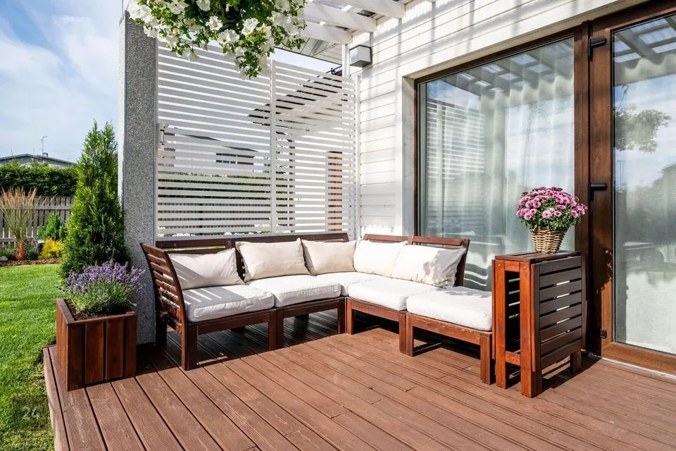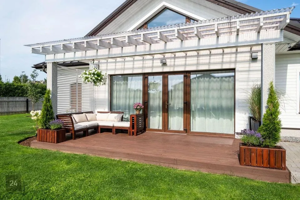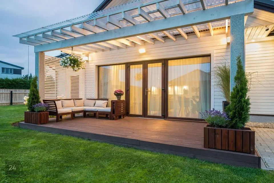 • Viimistletud puitkonstruktsioonile rajatud terrass, millel on valguskatus, terrassi põrandaks on sügavimmutatud puitlaudis.