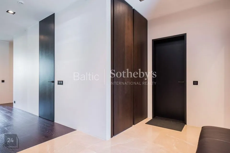 Efektse sisekujunduselemendina mõjuvad ka maast laeni kõrguvad siseuksed. Siseviimistluses on kasutusel naturaalsed ja kvaliteetsed materjalid, tammeparkett ja looduskivi. Mugavuslahendusena on kasutusel trepiastmete alla peidetud valgustus, mis süttib kohe, kui trepiastmele astuda. Teise korruse pärliks on kindlasti suur päikeseterrass. Tõeliseks harulduseks on aga kõik kolm magamistuba kuna igal neist on oma garderoob ja dušširuum. Ka kõik magamistoad on sisustatud Itaalia disainmööbliga.