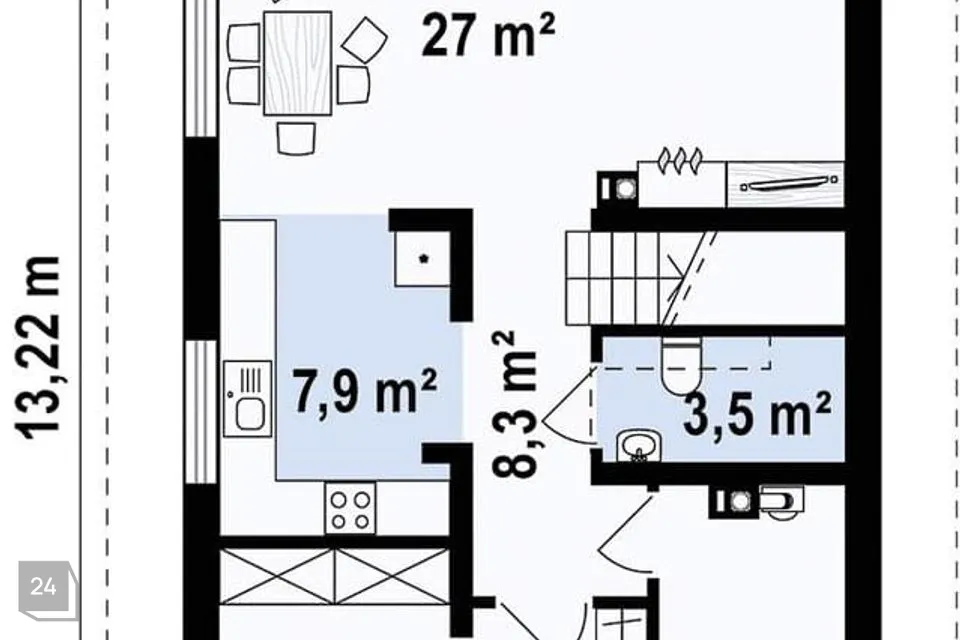 Maja ehitisealune pind on 83 m2. Eluaseme pind on 75,2 m2.