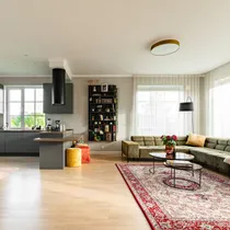 Köögis on kõrgekvaliteetne mööbel koos Electrolux köögitehnika (integreeritud külmik, ahi, induktsioonpliit, lai nõudepesumasin, mikrolaineahi) ja Franke sanitaartehnikaga.