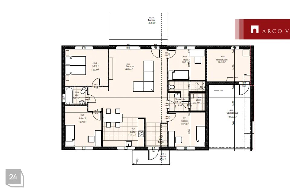 Paarismaja boksi köetav pind 135,3 m², millele lisandub 16,8 m² terrass ja autovarjualune 26,6 m².
