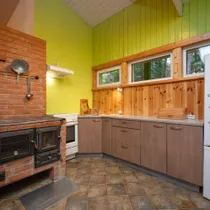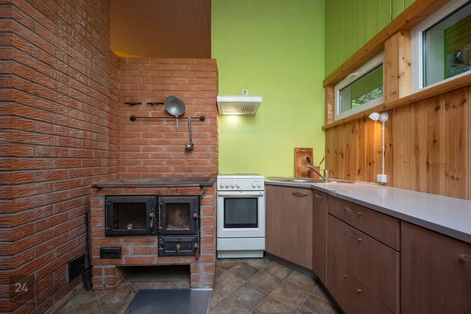 Köögimööbel on valmistatud eritellimusena. Pliite on Sul koguni kaks, elektripliit ja praegusel ajal juba vähem levinud, kuid samas parima toidu valmistaja - puupliit. Puupliit aitab ka kodu soojana hoida, kuna pliidi kütmisega soojeneb ka soojamüür. Köögitehnikast on veel lisaks külmik ning üsna hiljuti soetatud õhupuhasti.
